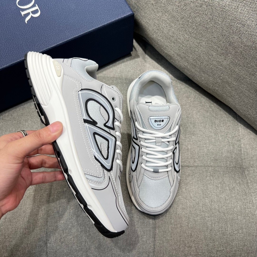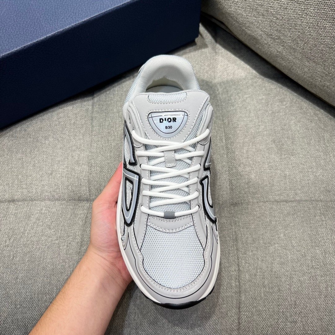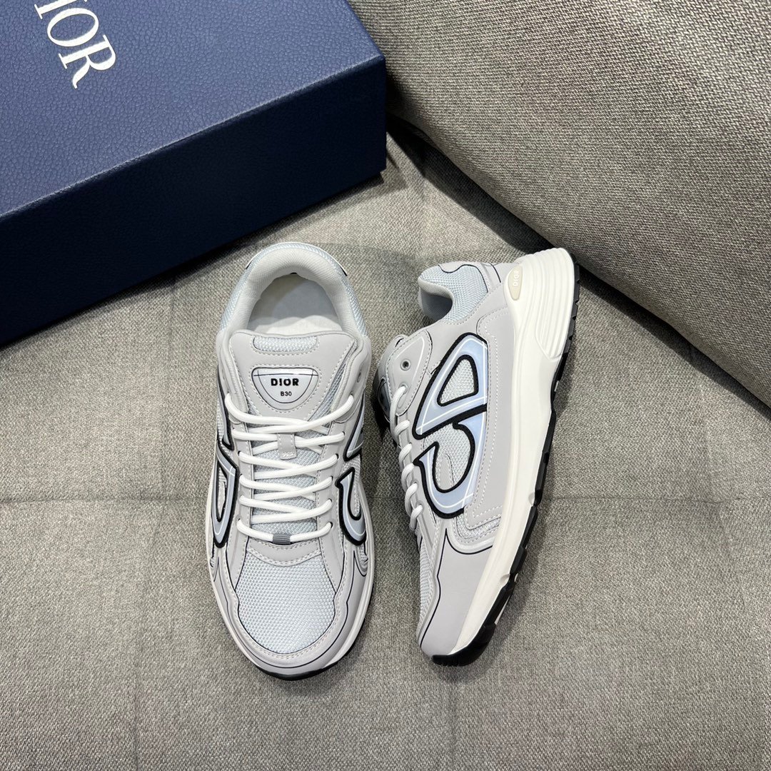B30 运动鞋以其现代和运动的轮廓而成为新品牌的必备单品。采用白色网眼布和高科技面料制成,反光“CD30”标志更具图形美感。 B30 还在鞋舌和运动鞋后部饰有银色“DIOR B30”和“CD30”标志。雕刻而成的超轻橡胶外底凸显了各种标志性细节,而弹性内部则提供了最佳的舒适度。 B30 运动鞋可搭配任何休闲装束。