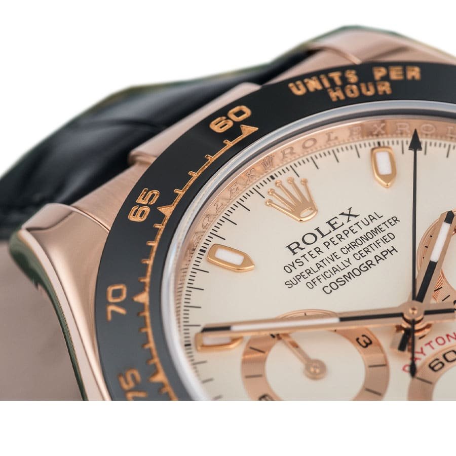 黑色可调节皮革表带增添了额外的奢华和舒适感,与玫瑰金 904L 不锈钢折叠表扣紧密贴合。劳力士宇宙计型迪通拿白色表盘 116515LN-0003 复刻表的每个元素都经过精心设计,以惊人的精确度反映原版,从相同的序列号和卡片到精确的字体、指针和标记的细致打磨。机芯和口径的厚度、尺寸和功率都经过巧妙复制,以确保真实的体验。