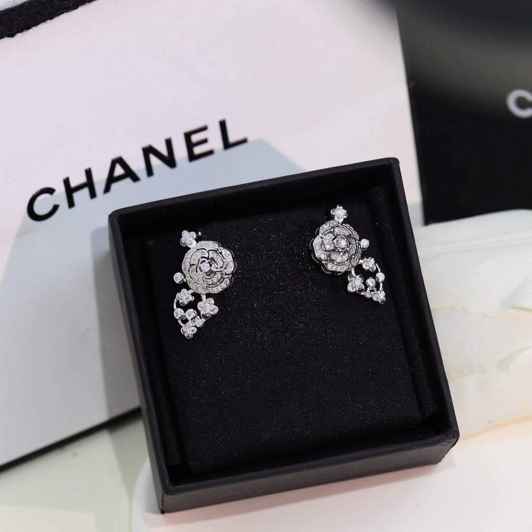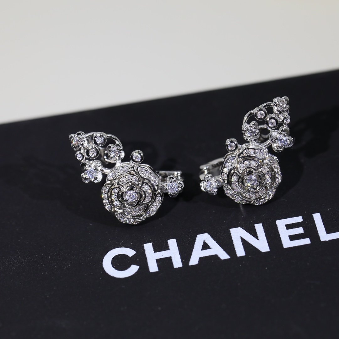 Chanel 空心山茶花耳环银色