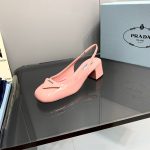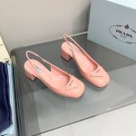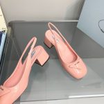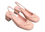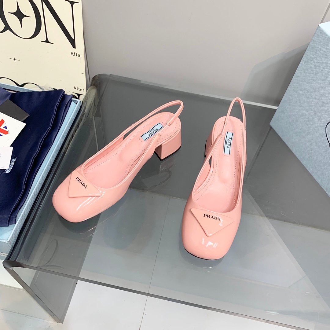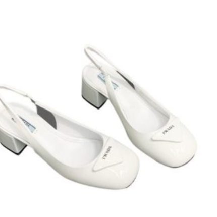 专利露跟高跟鞋是该品牌标志性三角形的新变体,将其变成略带衬垫的细节,饰有丝网印刷的 Prada 徽标。几何元素装饰这些露跟高跟鞋的脚趾,专利中跟具有精致的光泽表面。