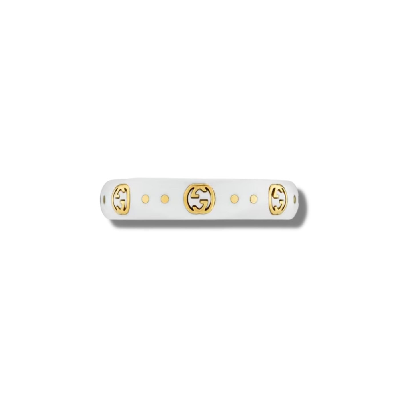 图标系列再现了品牌最具代表性的图案之一。 Interlocking G 代表创始人 Guccio Gucci 的姓名首字母,采用黄金材质,与白色合成刚玉带形成鲜明对比。