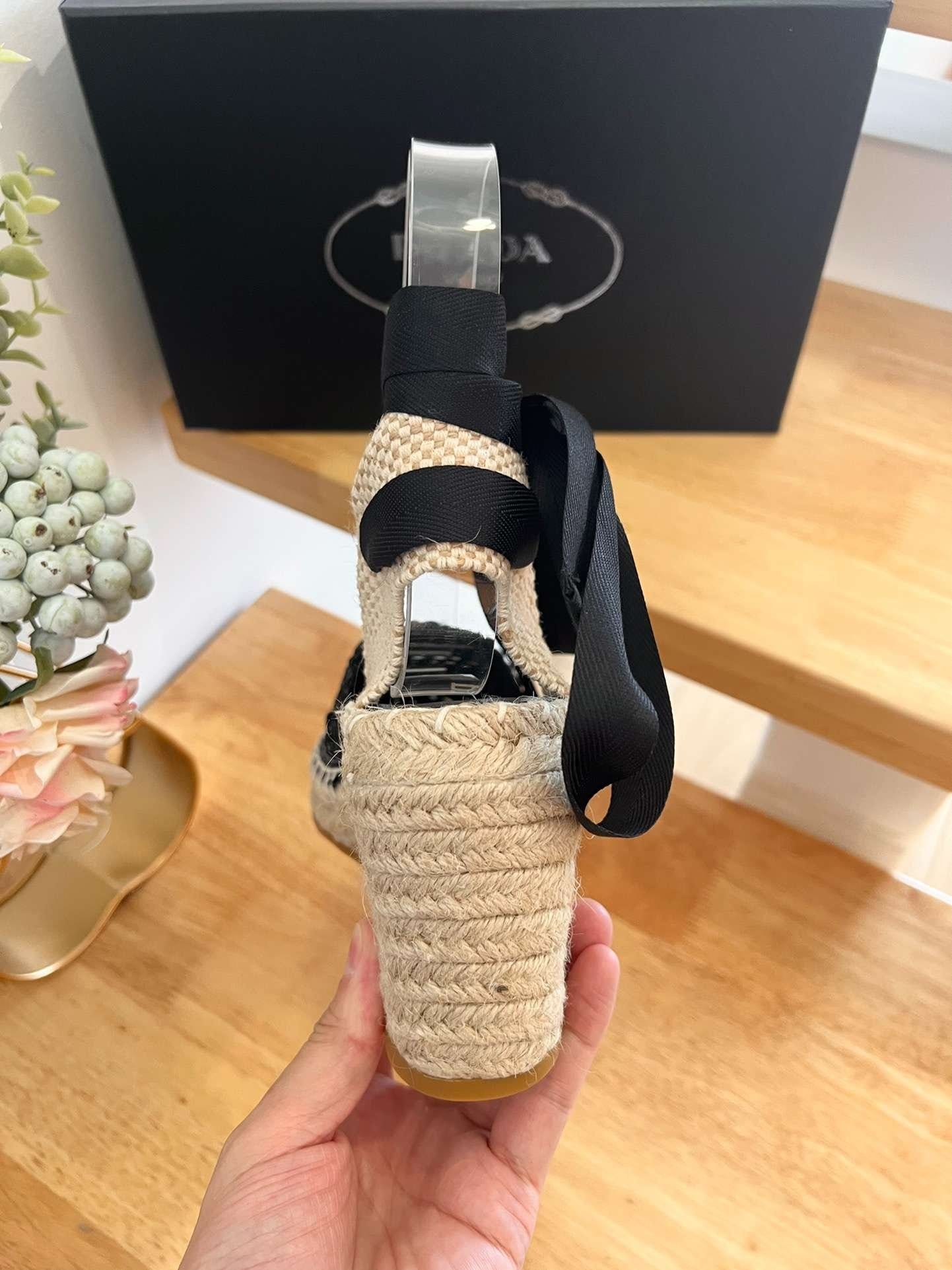 Prada 亚麻麻底坡跟凉鞋黑色