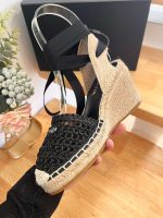 女式亚麻麻底坡跟凉鞋黑色