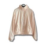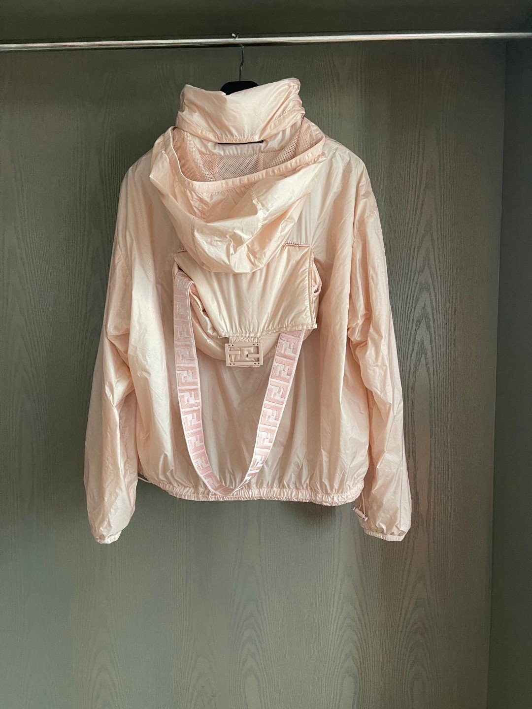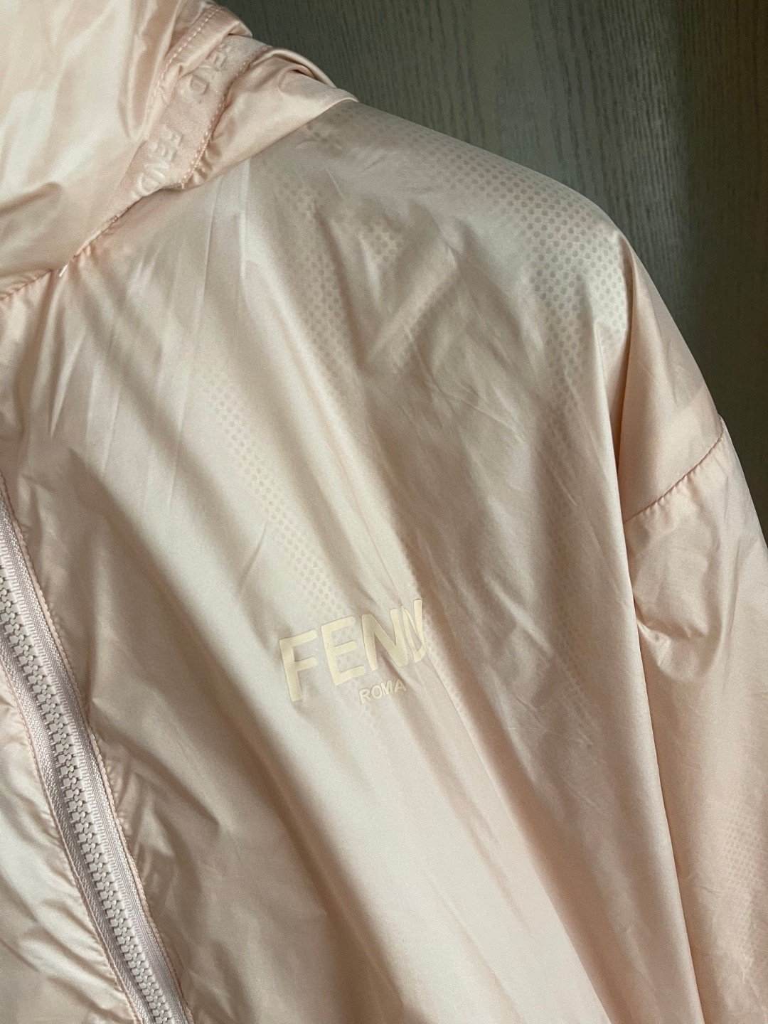 夹克配有抽绳兜帽和侧拉链口袋。后腰部有内部抽绳,罗纹袖口。拉链开合,配有同色系双拉头。采用柔软材质制成,表面光滑。腰部侧带带有金色金属 FF 扣。