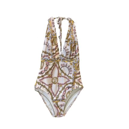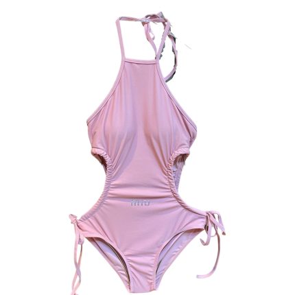 熟悉的连体泳衣造型,腰部剪裁营造出酷感,吊带背心造型,颈部系带,颈部系带裤子的腰部。