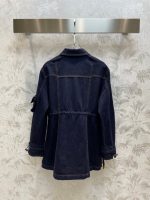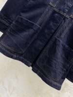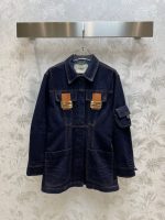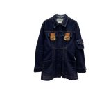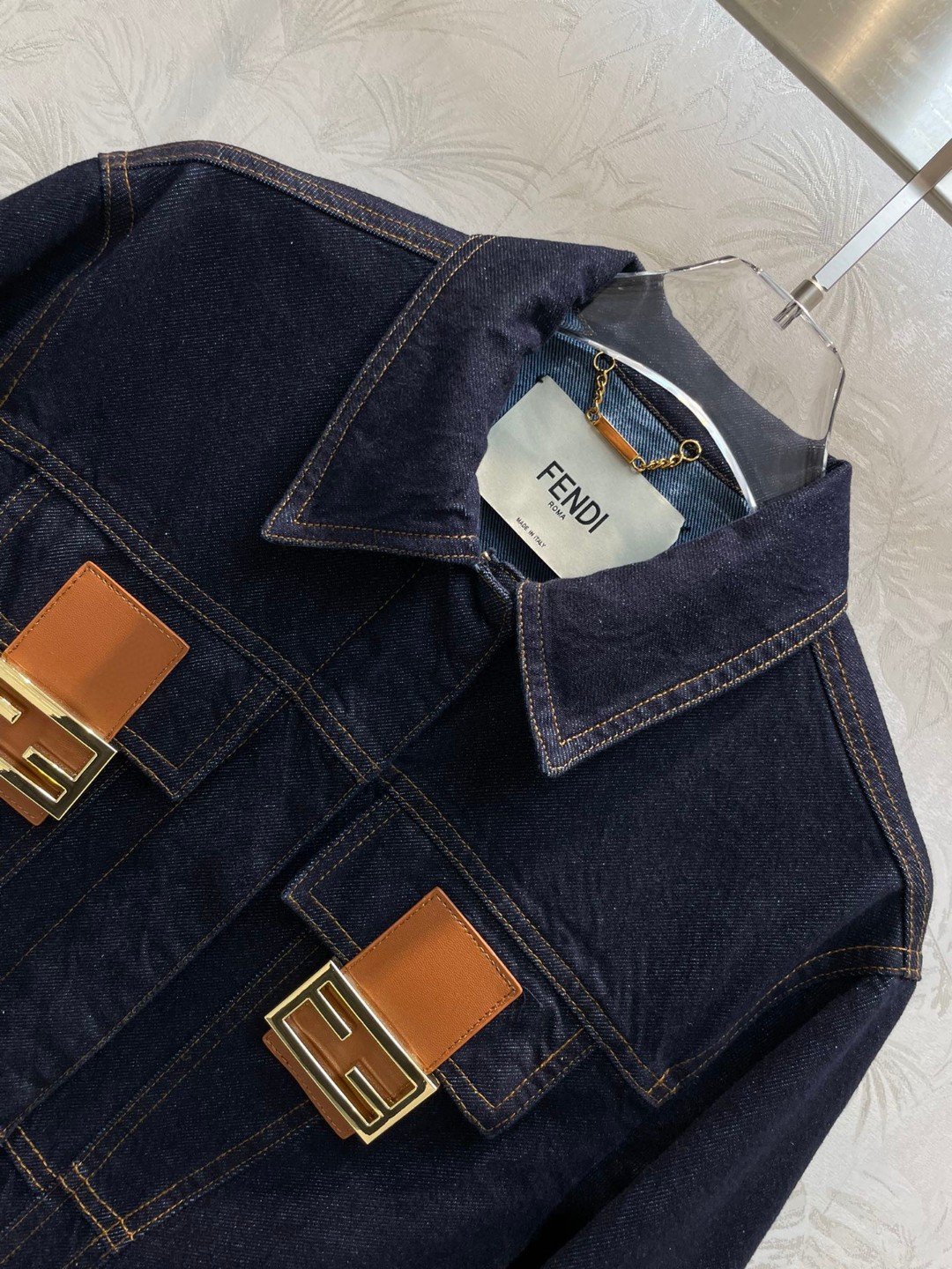 修身夹克,衬衫领和长袖。采用徽标按扣纽扣开合。采用蓝色棉质牛仔布制成,饰有经典烟草色明线。胸前的贴袋饰有皮革细节和金色饰面的金属 FF Baguette 带扣。