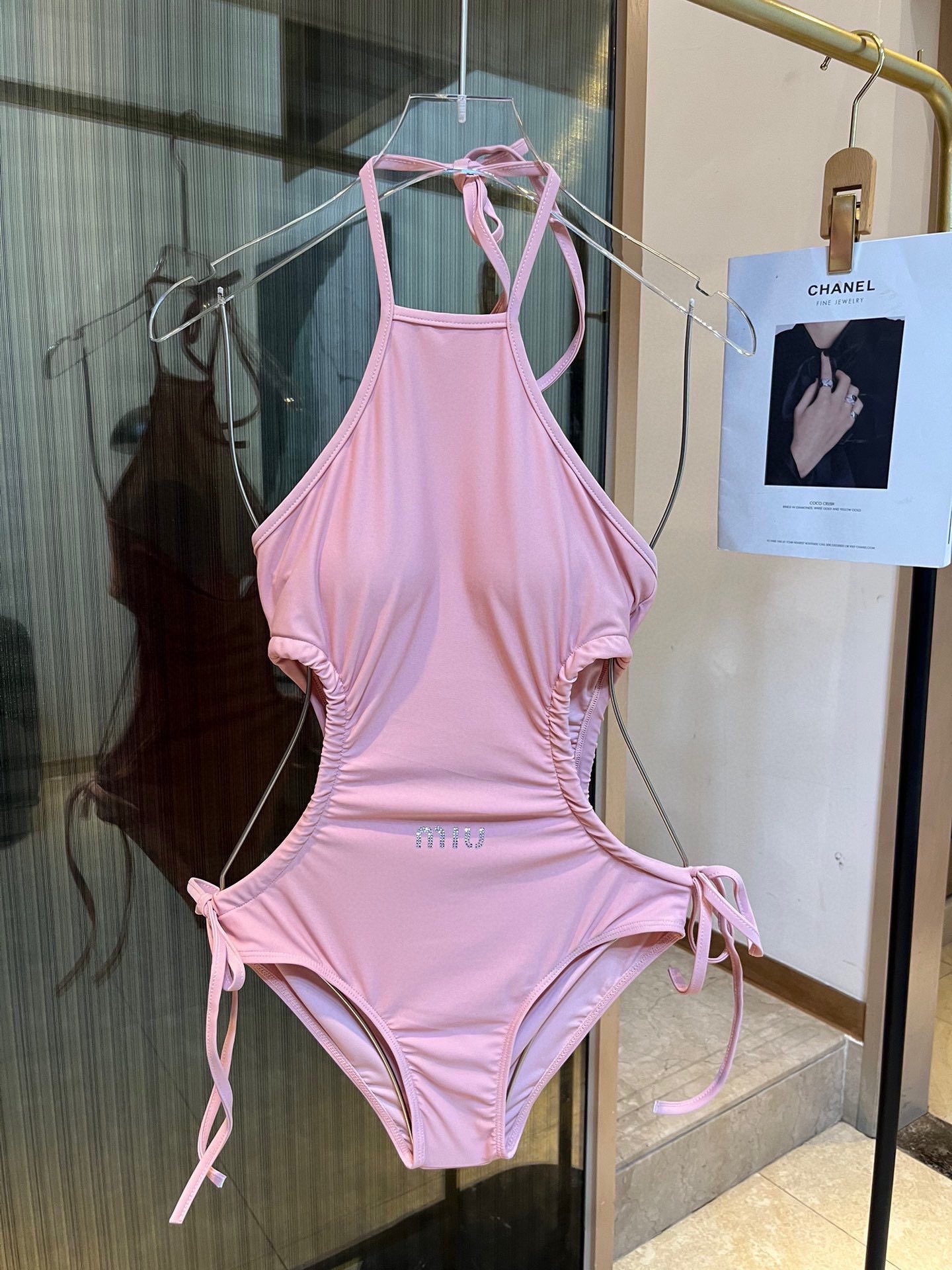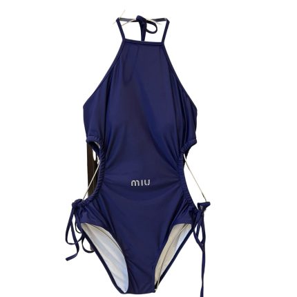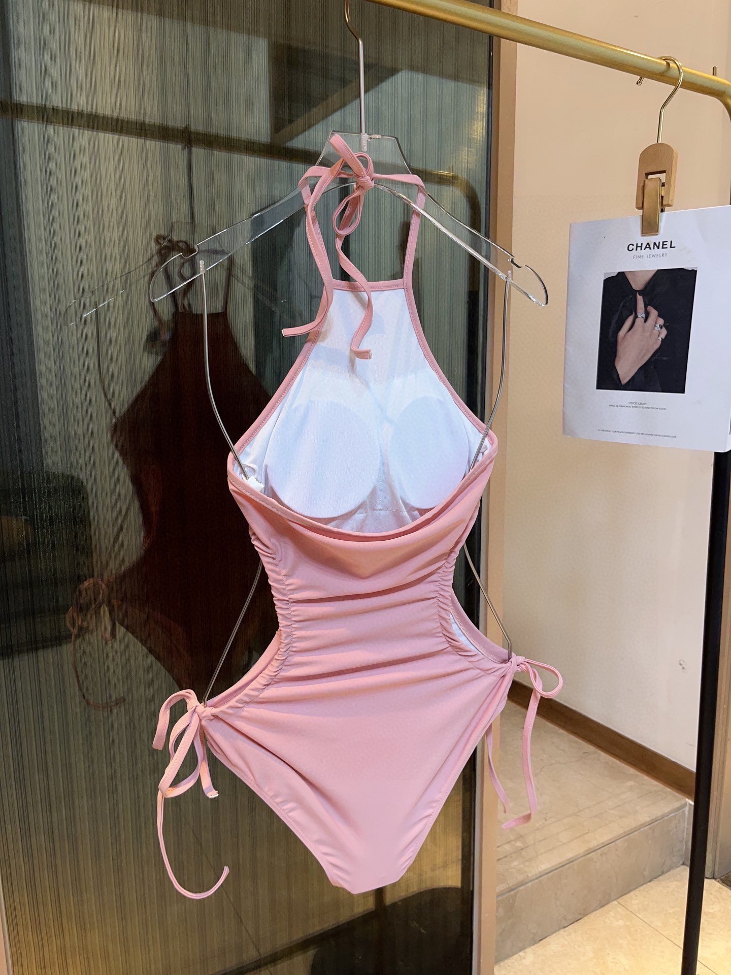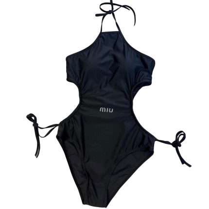 熟悉的连体泳衣造型,腰部剪裁营造出酷感,吊带背心造型,颈部有系带,后部有系带裤子的腰部。
