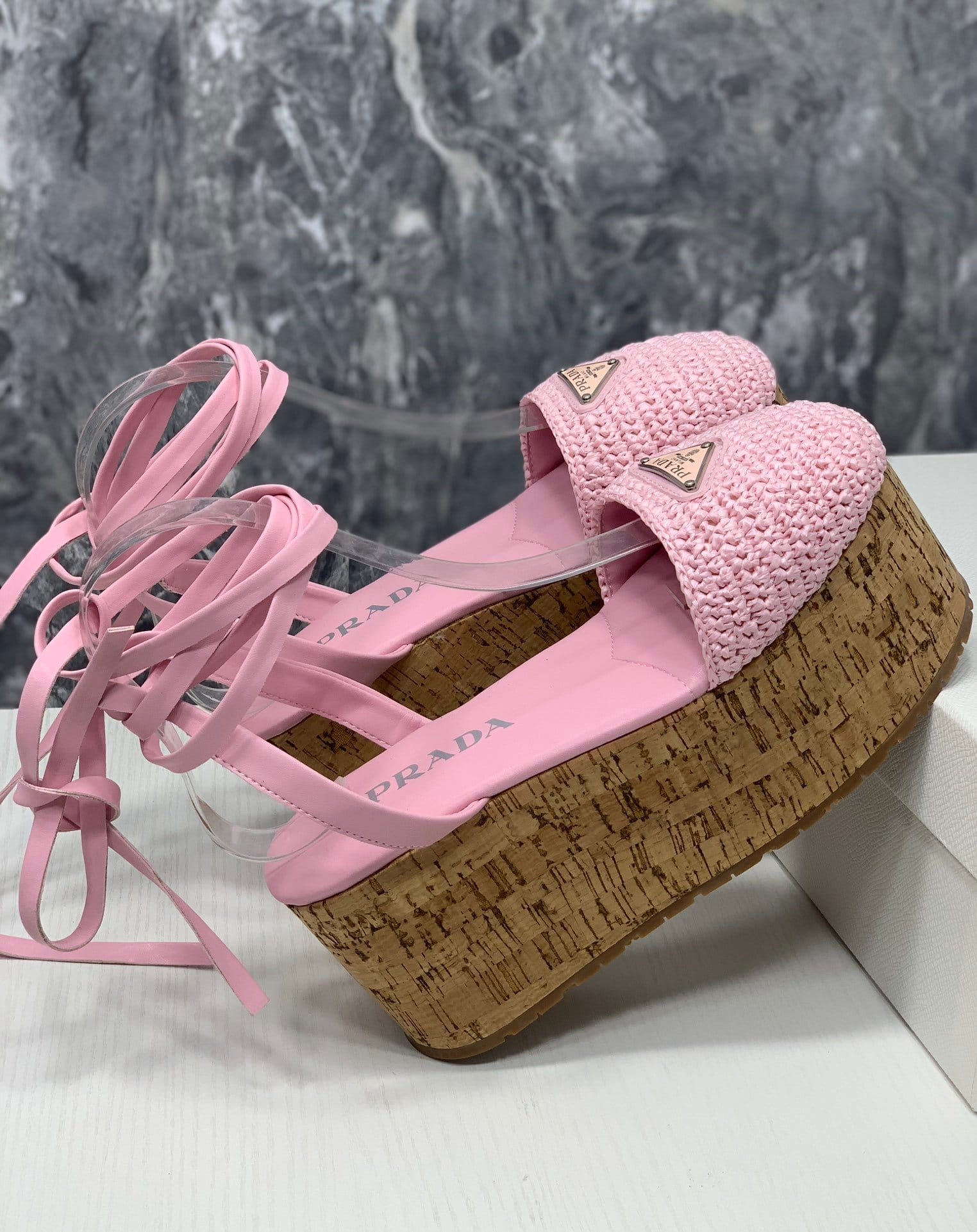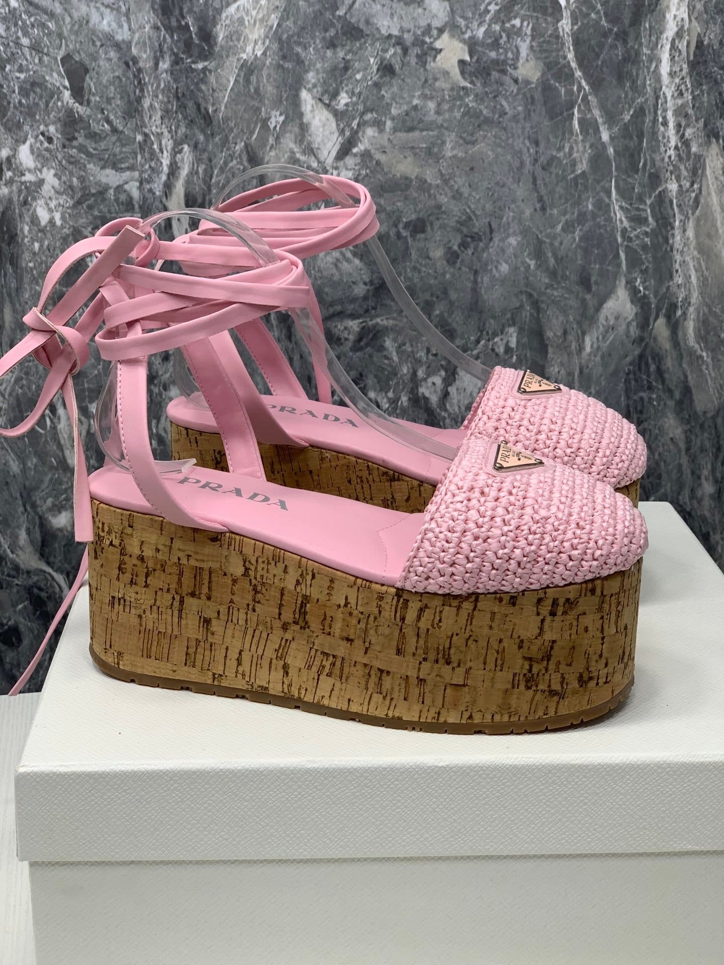 简单而精致的钩针图案增强了这款凉鞋的设计,配有软木坡跟和踝带。 Prada 三角形徽标为鞋子增添了标志性气息。