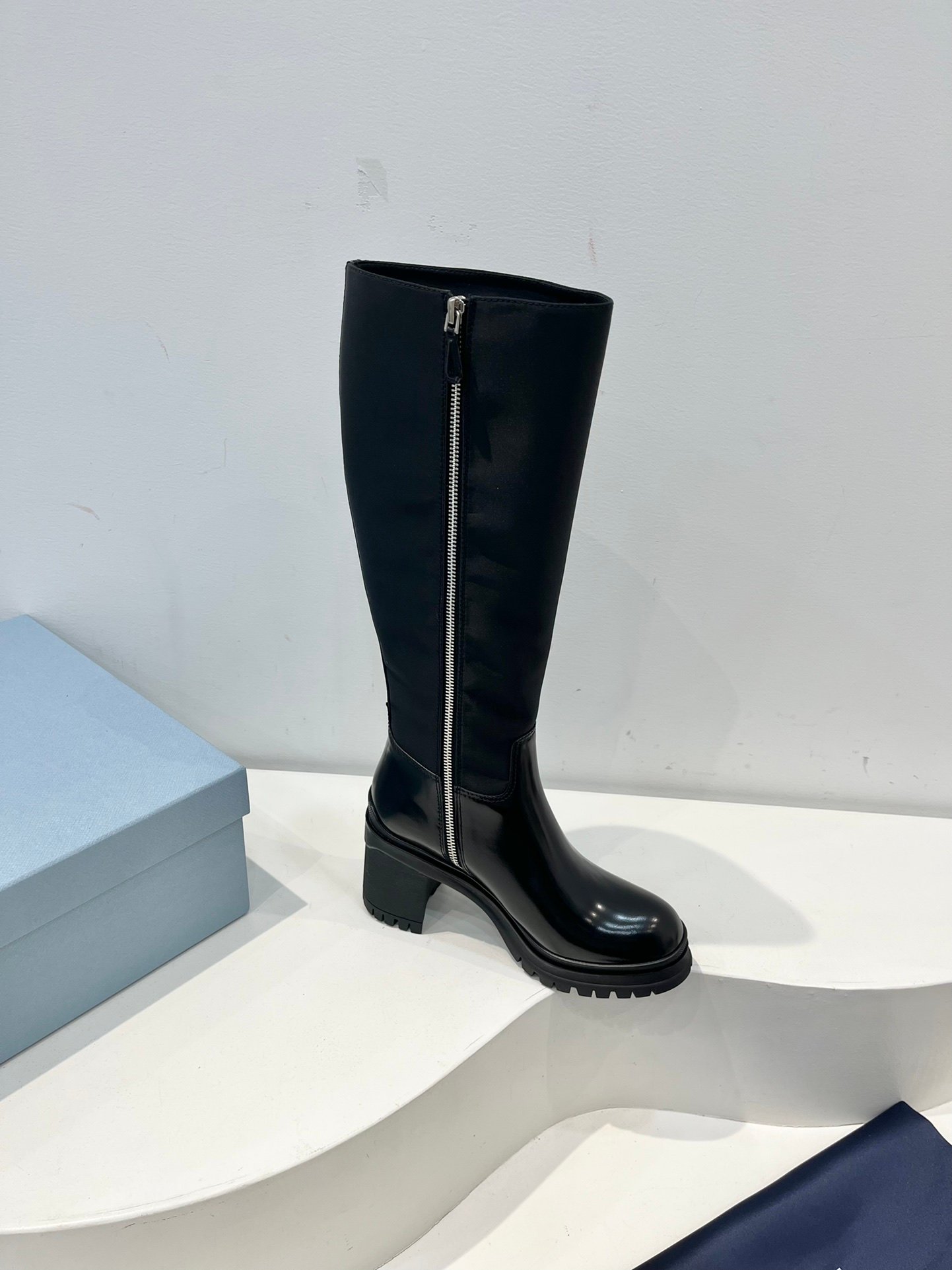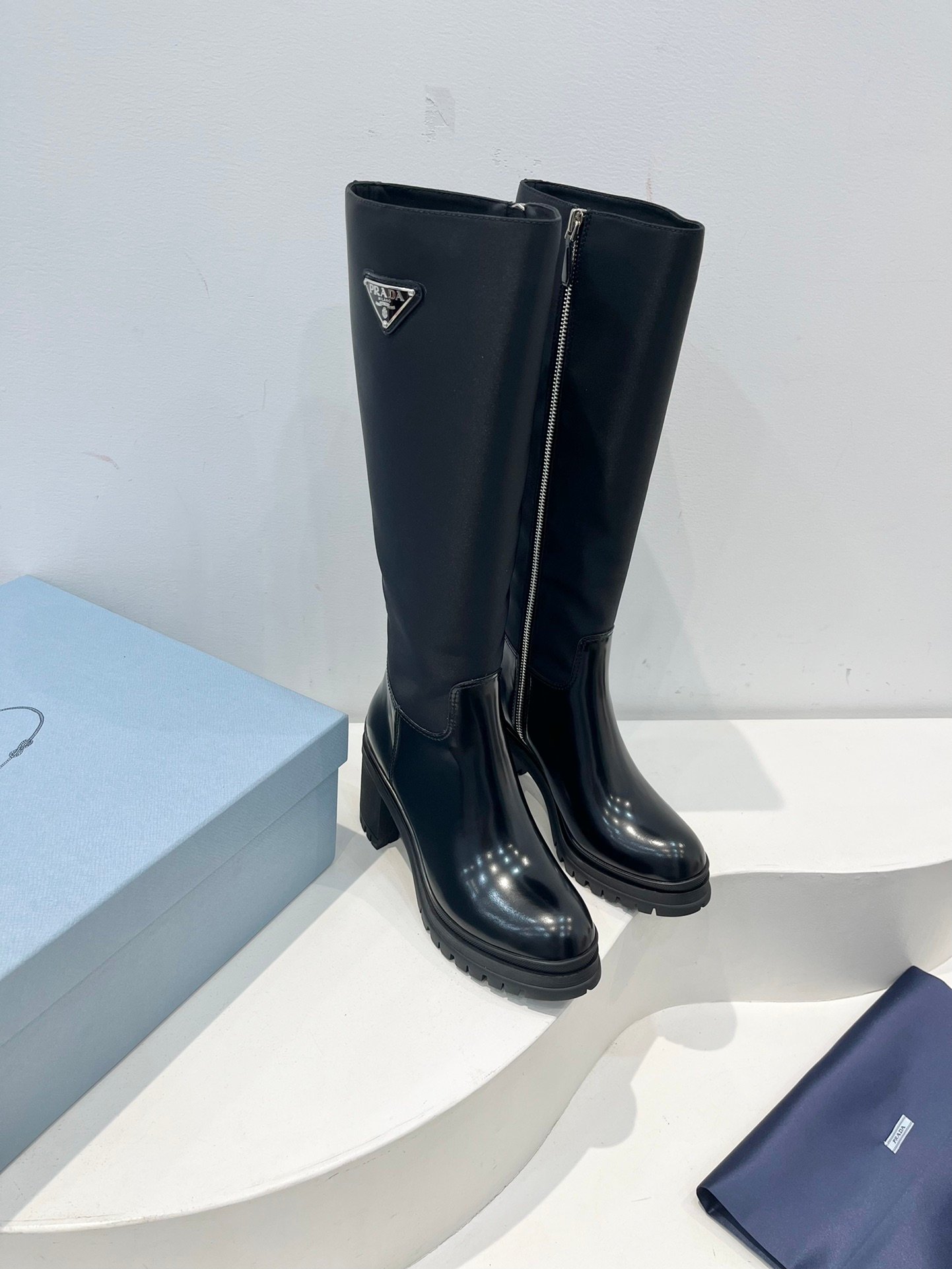 拉丝靴子是标志性 Prada 材料的和谐对比,定义了这些高跟靴子的设计。现代设计中的优雅,集精致与活动自由于一身。