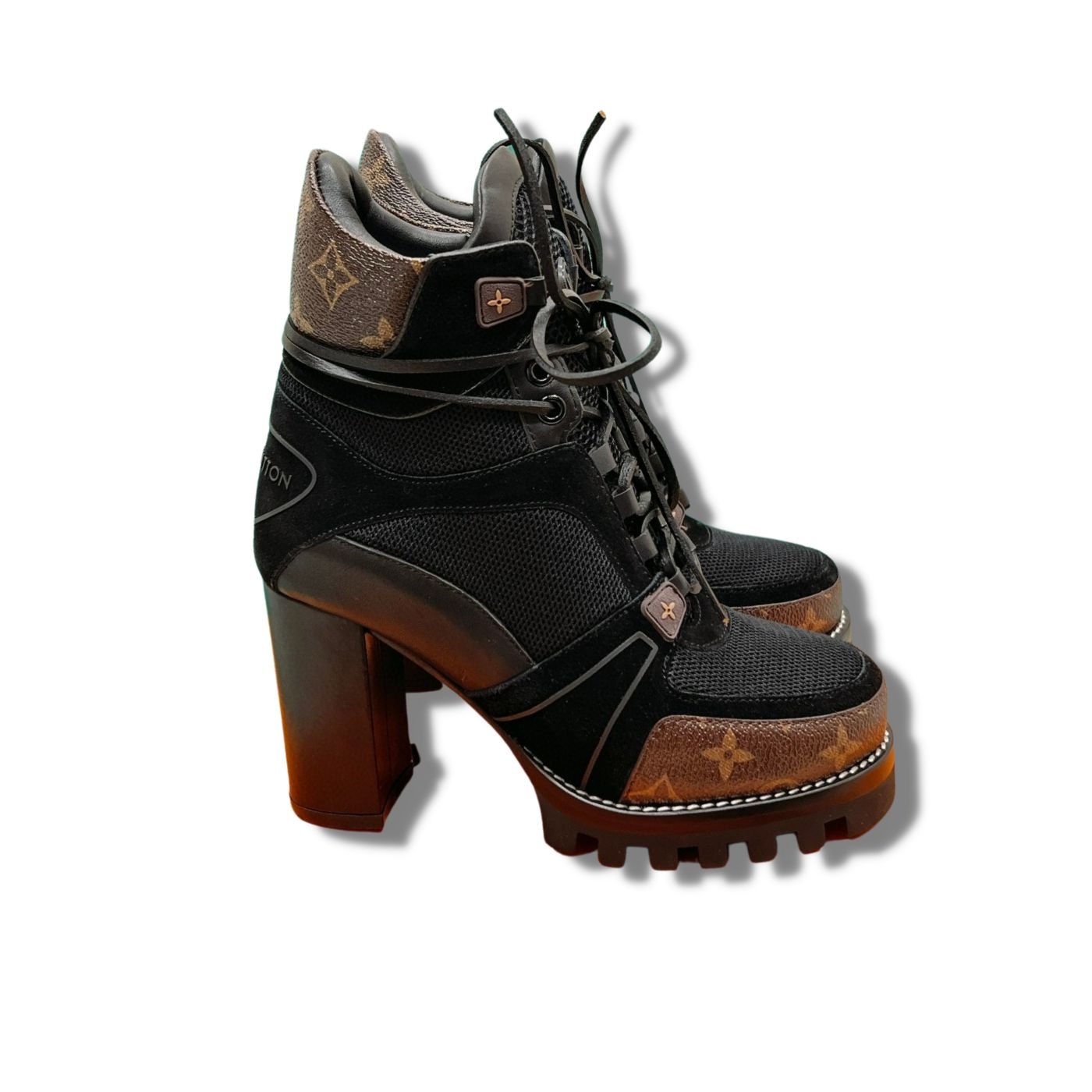 作为路易威登的标志性款式之一,星轨踝靴采用绒面小牛皮和漆皮交织帆布重新设计。该设计融入了受运动鞋启发的元素,特别是鞋面的技术网布以及带衬垫的鞋舌和鞋领。这种大胆风格的特点是高跟和纹理橡胶外底。