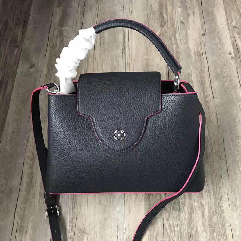 - 结构:3个拉链外袋;1个内插袋;1个拉链内袋,皮革顶部提柄;可调式皮革拼链饰肩背带,扣环与抽绳开合,亮泽金属配件