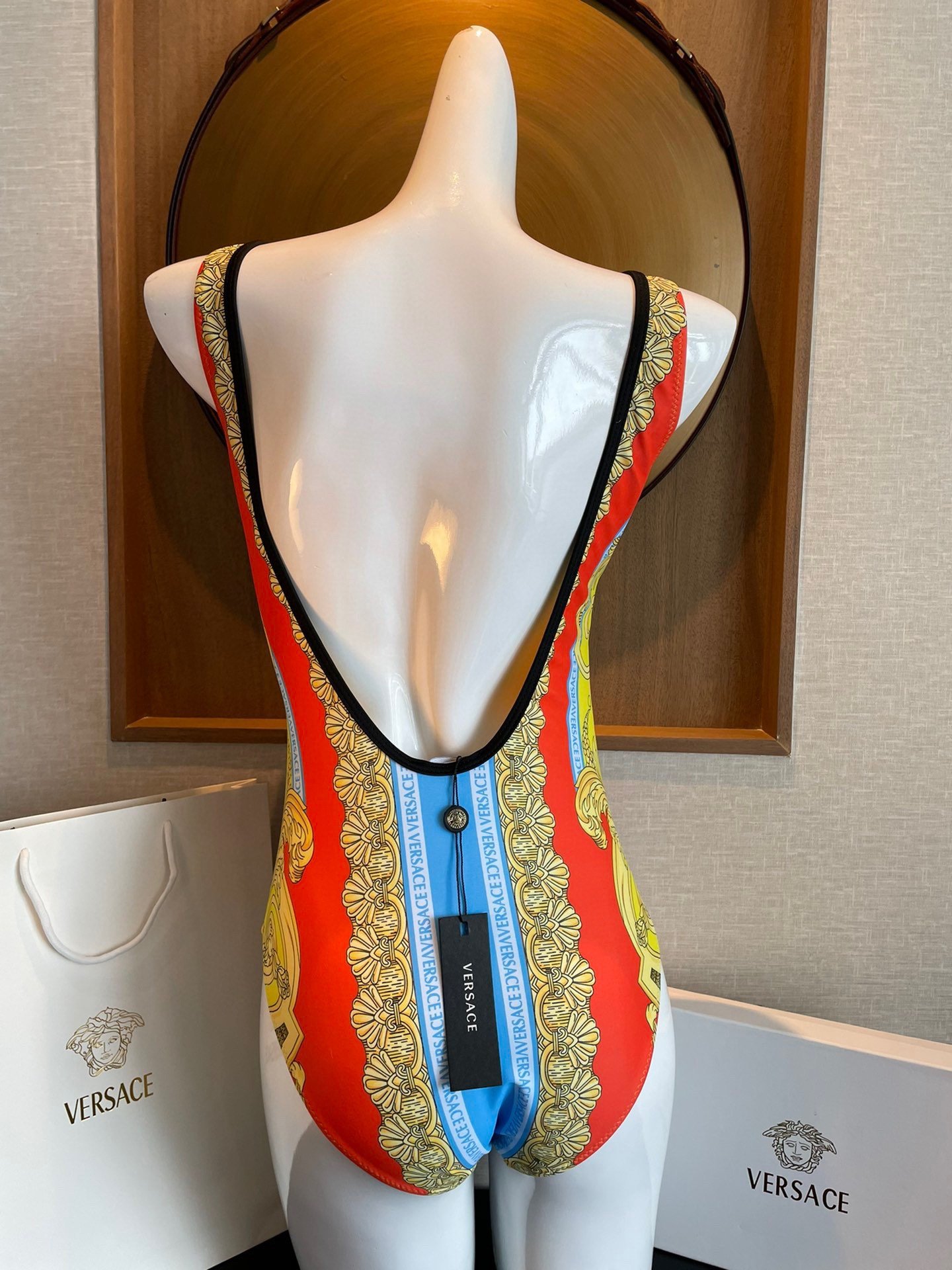 这款泳衣具有标志性的 Barocco 印花,一眼就能辨认。经典款式的特点是低背线和高腿部线。
