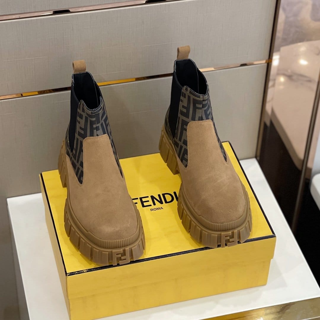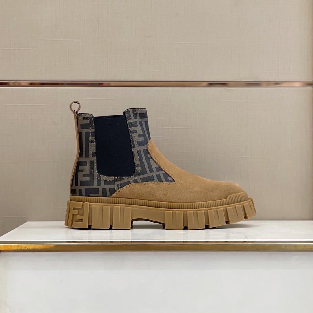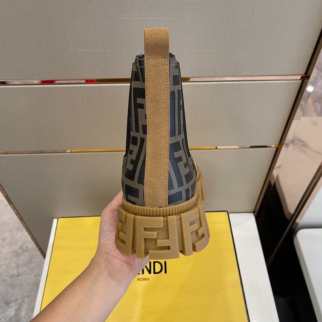 Fendi Force 切尔西靴,方头,两侧有松紧嵌片。采用深色 FF 提花面料制成,细节为烟草色。轻质橡胶鞋底,脚趾和脚跟处有浮雕 FF 细节。