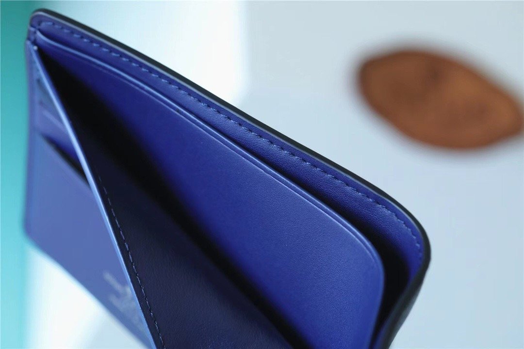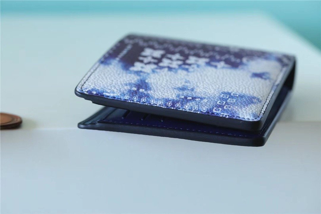 经典细长钱包在柔软,蓝色头巾背景上饰有 LV 和花押字图案的不规则漂白图案。 Slenders 巧妙的内部设计可容纳所有必需品,同时保持时尚的外形,可轻松放入大多数口袋。