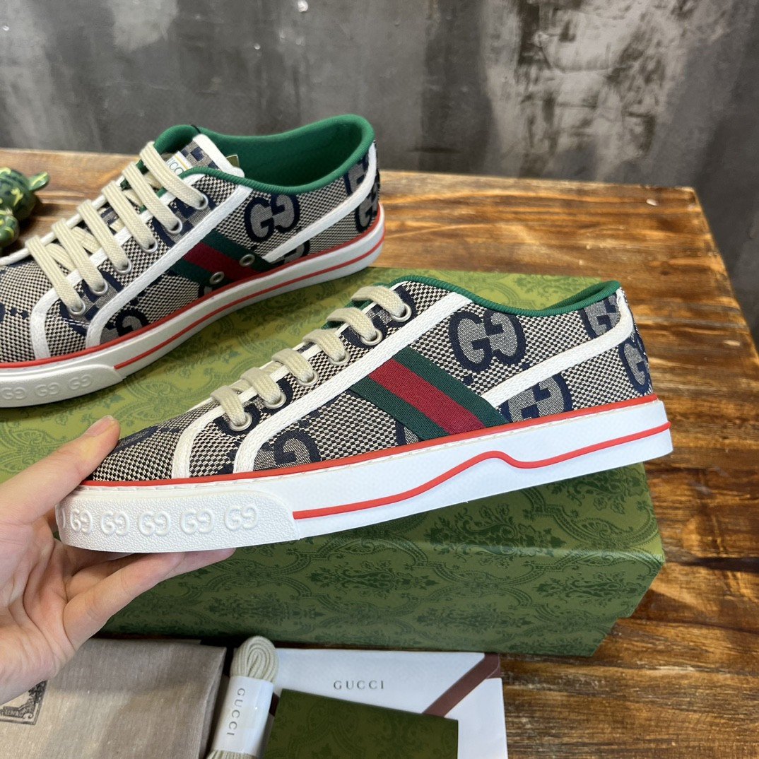灰白色棉质低帮运动鞋。该款式融合了品牌传统的不同元素,例如 Gucci Tennis 1977 标签、鞋底纹理 GG 图案以及品牌织带细节,让人回想起品牌与运动和休闲世界的联系。
