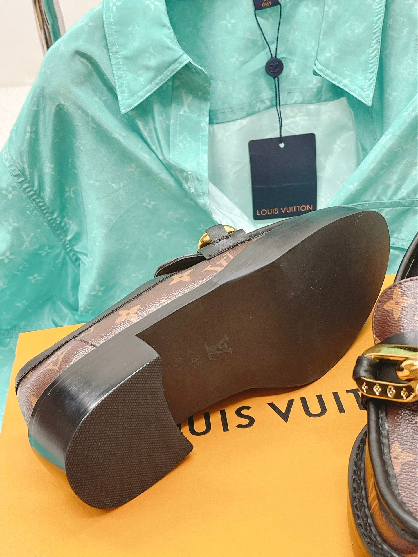 Academy 乐福鞋将棕色与 Louis Vuitton 标志性的 Monogram 相结合。经典男孩风格,夸张外底。