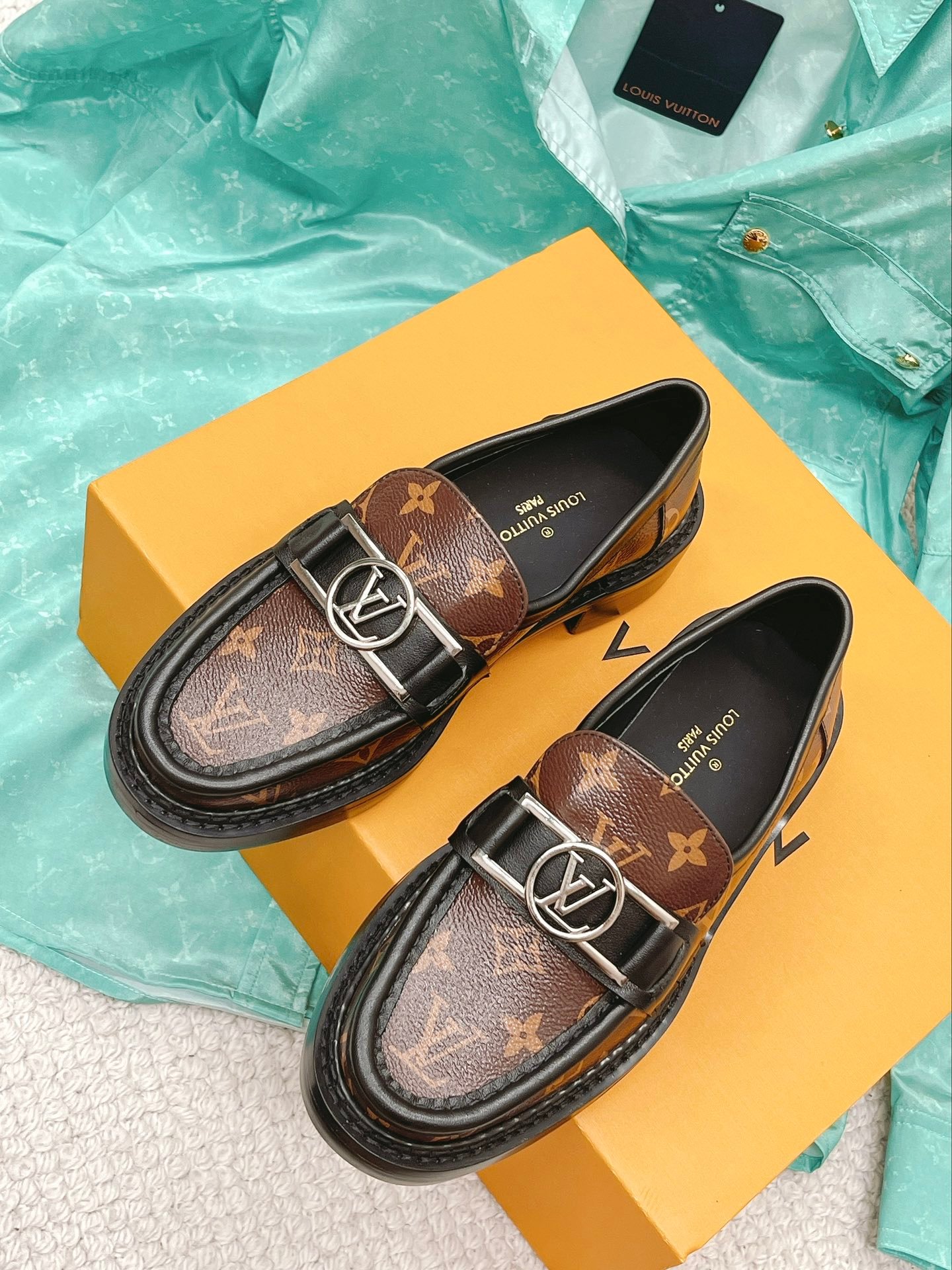 Academy 乐福鞋将棕色与 Louis Vuitton 标志性的 Monogram 相结合。经典男孩风格,夸张外底。鞋面饰有银色 LV Dauphine 标志,参考 Dauphine 手提包的搭扣。