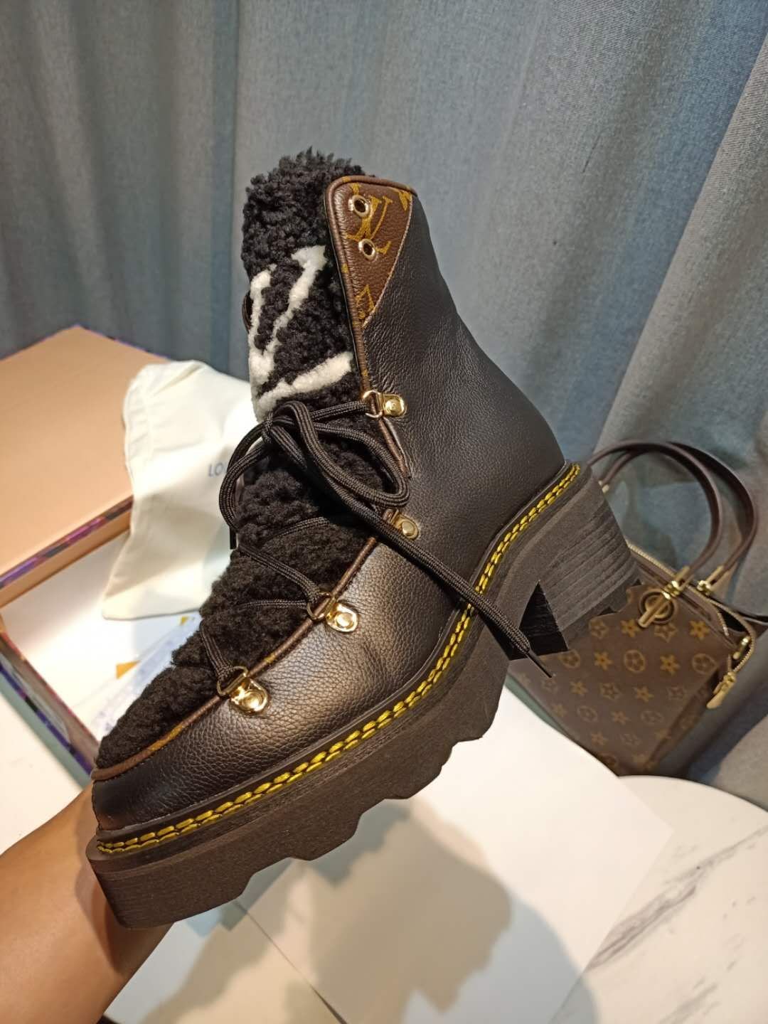 Beaubourg 踝靴采用粒面和羊毛皮组合制成,辅以 Monogram 饰边。该款式的灵感源自登山靴,采用温暖的衬里和羊毛皮鞋舌,并饰有超大 LV 首字母标志。其厚重而轻质的外底有一个平台,可谨慎地增加额外的高度。