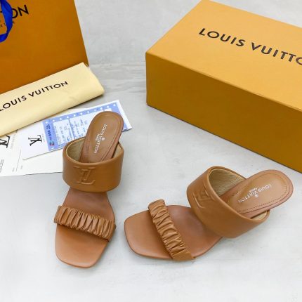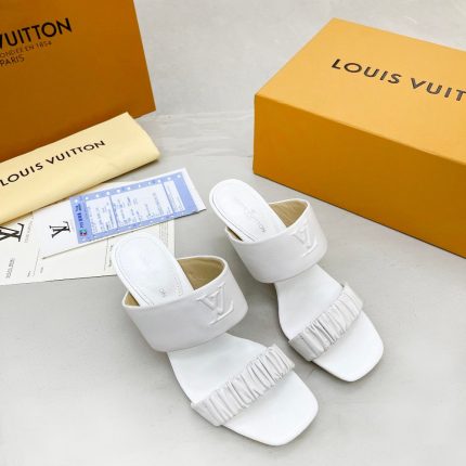 Drapy 穆勒鞋采用极其柔软的材质制成,具有女性风格。它的特点是有两条带子:一条细长且有精致的褶皱,另一条则较宽并刻有 LV 首字母。这款鞋款还配有小猫跟,还配有加垫鞋床,提高舒适度。