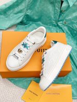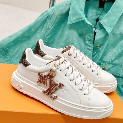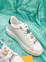 这款版本的 Time Out 运动鞋采用光滑面料制成,背面饰有饰边。鞋面饰有三种不同的蕾丝配饰:Monogram Flower、刻有 LV 的心形和多彩的 Louis Vuitton 签名。它们为这款标志性设计带来珍贵、俏皮的感觉,并因其时尚的加高外底而闻名。