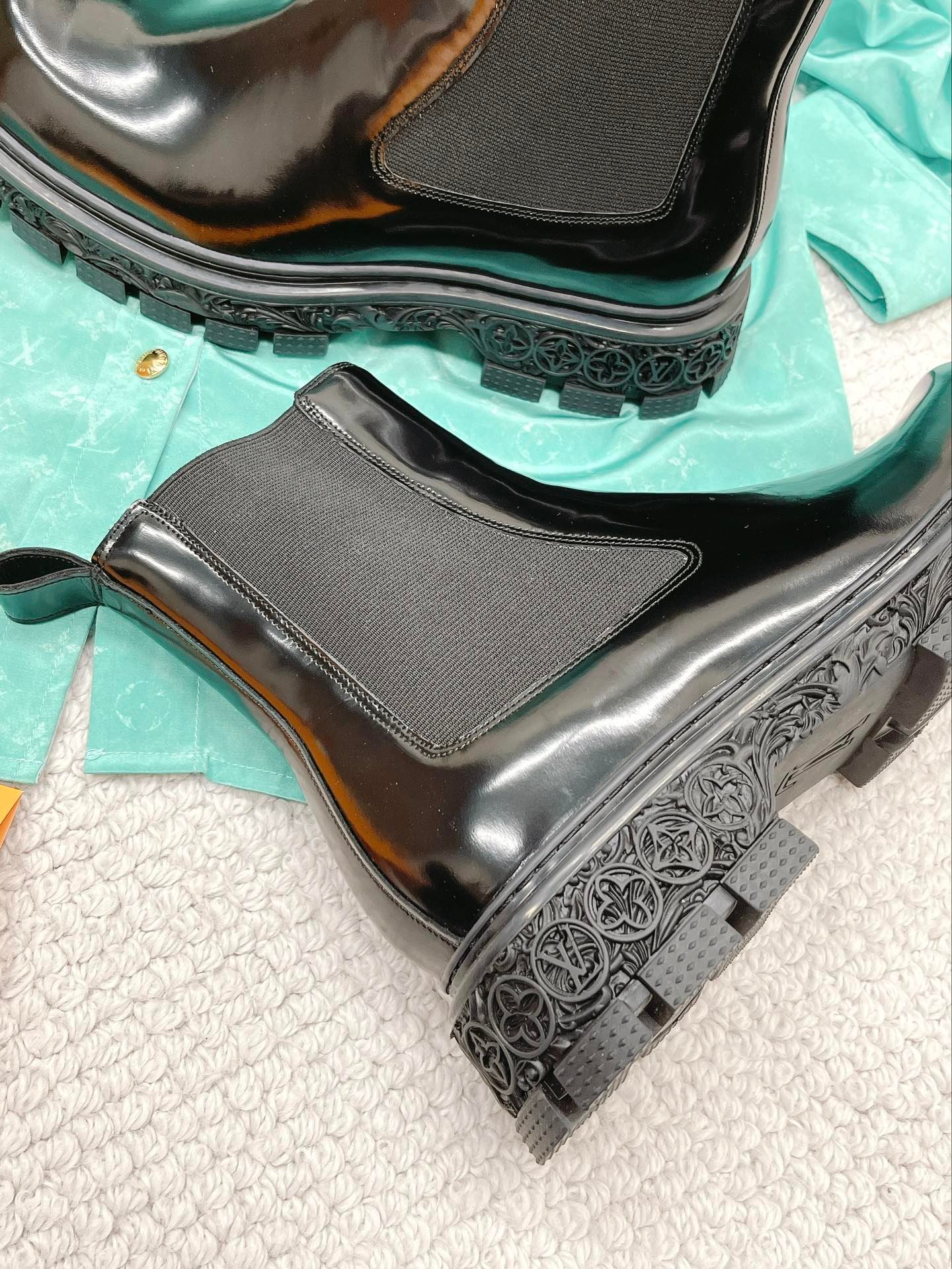 LV 巴洛克切尔西靴是经典款式的时尚前卫更新,曾在路易威登 2022 年秋冬系列中亮相男装秀。光滑,外底正面刻有 LV 首字母,两侧刻有 Monogram 花朵,营造出装饰性 3D 效果,鞋底上也刻有 Monogram 花朵。