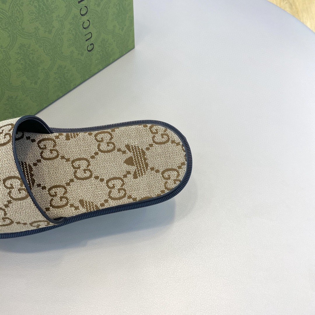 一双平底凉鞋,采用米色和乌木色的花押字帆布制成。 GG 标志首次使用于 1970 年代,是 1930 年代原始 Gucci 菱形设计的演变,从那时起,它就成为 Gucci 传统的既定象征。
