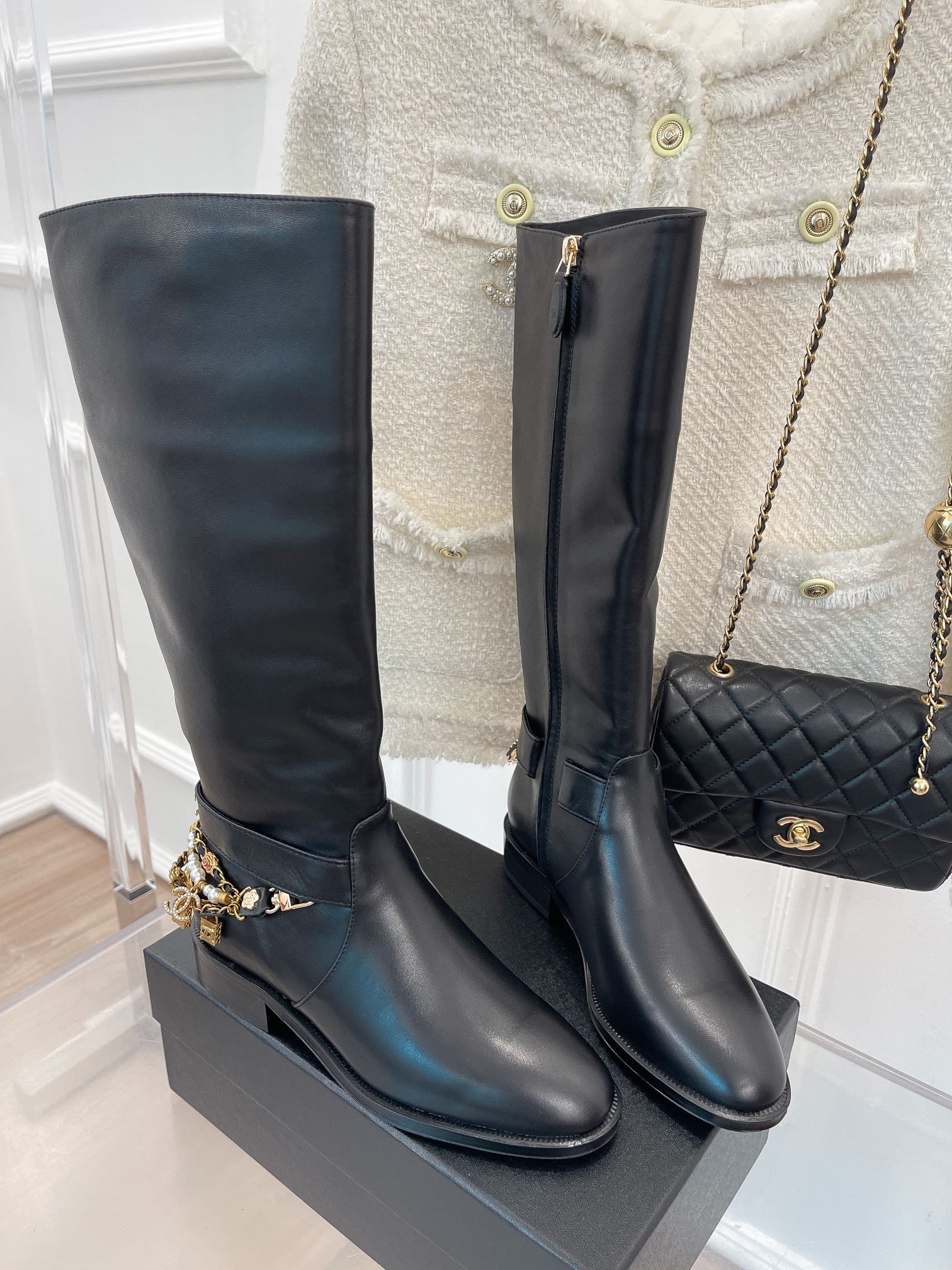 香奈儿女士黑色装饰高筒靴 1.5 英寸/4 厘米