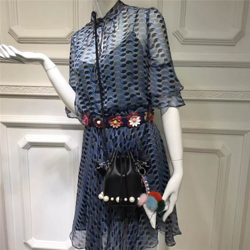 - 详细介绍:2018早春爆款,fendi 灵魂设计迷你桶包、女神大爱单品,真空电镀五金。小型款水桶包,抽绳开合,缀以FENDI标志造型金属装饰。手袋配有两条可拆卸肩带,一长一短,供肩背或斜背。黑色小牛皮制作。缀以两种不同大小的珍珠。镀钯饰面金属配饰。