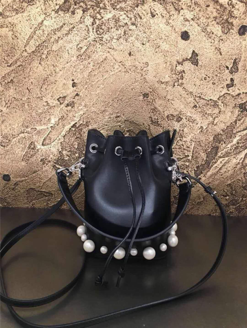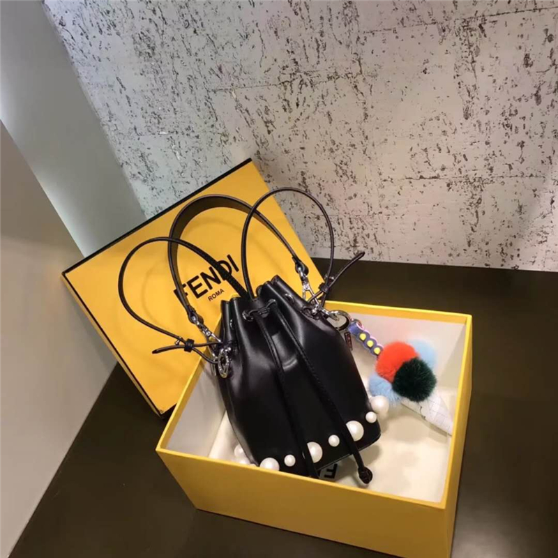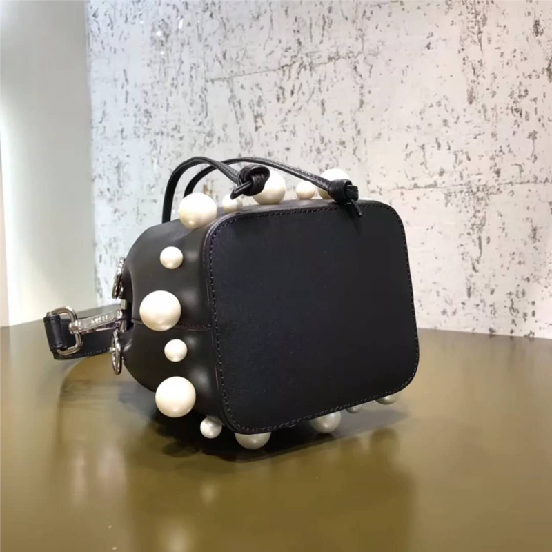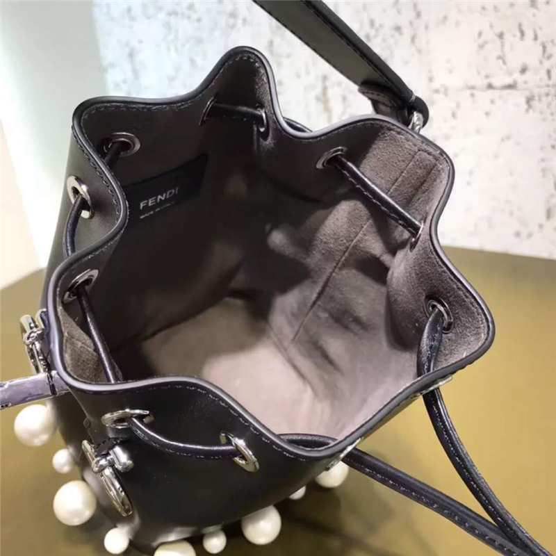 - 010 Fendi芬迪 MON TRéSOR 珍珠缀饰 纯色 抽绳水桶包 黑色