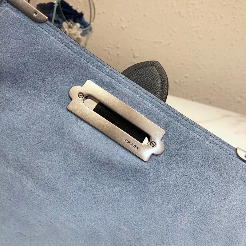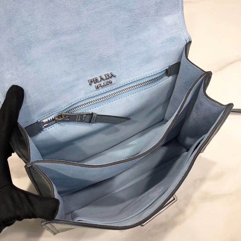- 详细介绍:Prada Cahier 手提包采用箱型设计,四角银质硬件如画龙点睛,增添优雅魅力。皮革手柄可作为单肩包使用。翻盖和带扣开合与精致的蓝色小山羊皮衬里相得益彰。