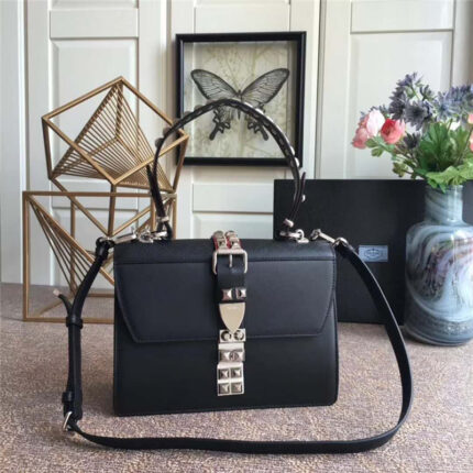 • 1BA179 Prada女包 普拉达休闲包小牛皮 铆钉皮革手柄 黑色