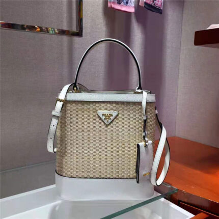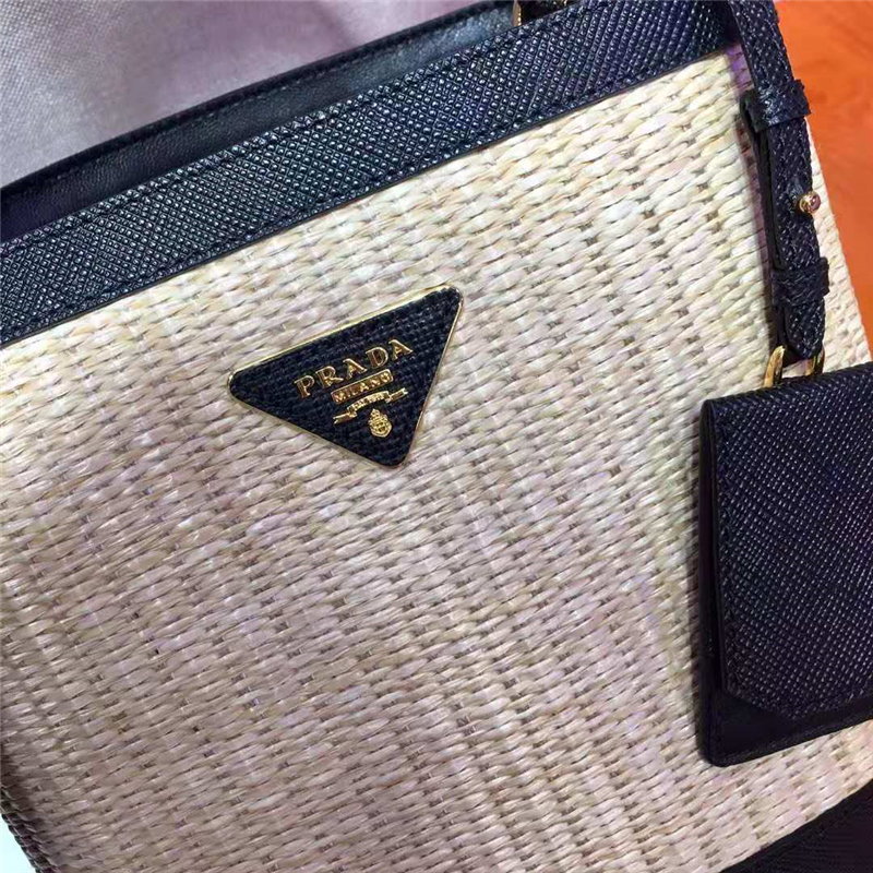 - 详细介绍:独家首发,原单货,2019年新款拉菲草系列,Prada Panier手袋,采用进口Saffiano皮革材质 ,纯手工拉菲草编织,可拆卸肩带、皮革铭牌和金属徽标相得益彰。皮革包覆式磁扣扣合的中央口袋 Saffiano皮革三角形徽标 撞色软羊革衬里, 这款 Double手袋款式优雅,醒目而别致,又是一款火爆款