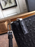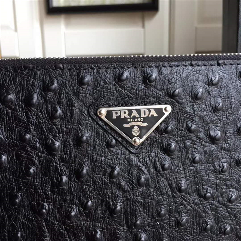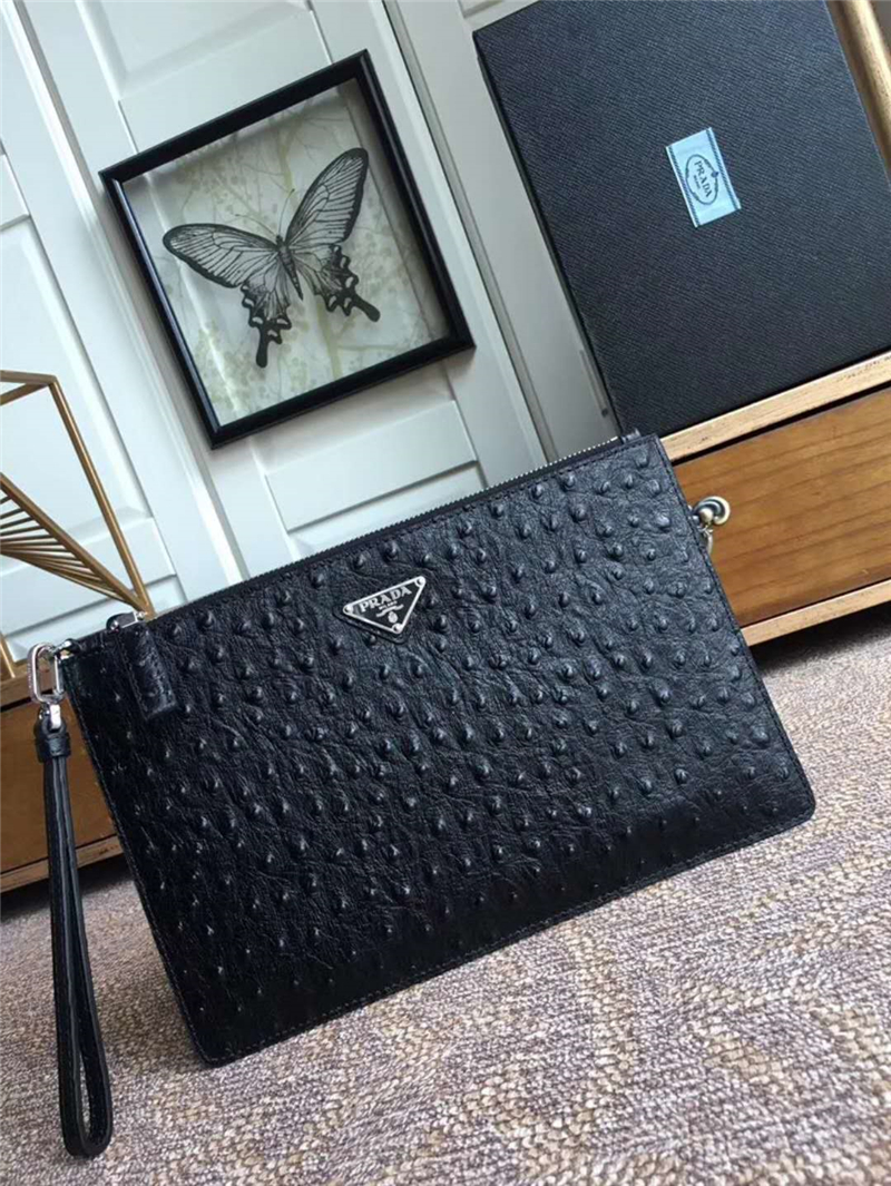 2VF006 Prada普拉达 鸵鸟纹牛皮 拉链 立体手拿包 黑色 角唛