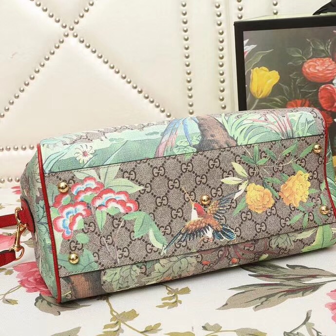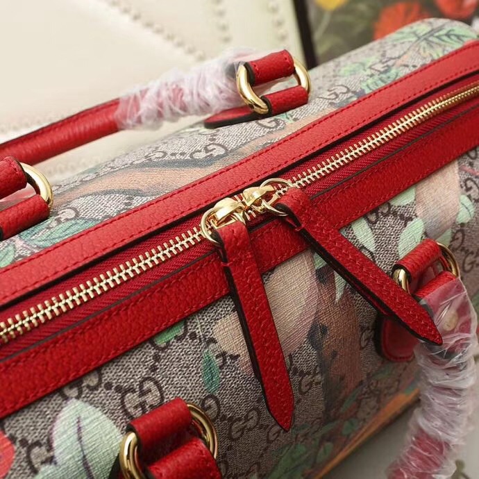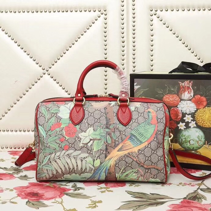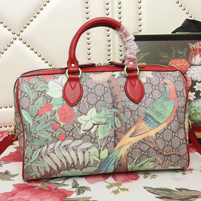 - 409527 GUCCI GG Blooms花鸟印花 帆布拼皮 波士顿手提包 红色