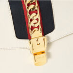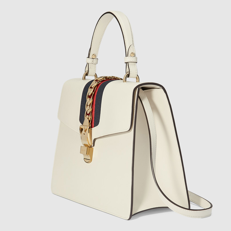- 详细介绍:sylvie 手袋采用绚丽的手提包造型,真皮下镶有尼龙织带,饰以金色链带和带扣。采用光滑、经典皮革精制而成。