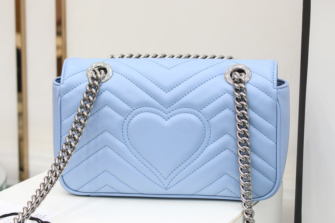 - 结构:淡蓝色绗缝V型图案皮革,饰心形图案 钯金色调配件 麂皮质感超细纤维衬里 双G 内部开口口袋,可容纳大型号的手机 滑动链条可调整为约 55 厘米的肩带,或长约 30 厘米的顶部手提带. 也可作为斜挎包使用. 弹簧扣翻盖 最大可容纳的手机尺寸:158毫米(长)x78毫米(宽)x8毫米(厚) 这款商品可容纳Gucci卡包 重量:约0.6千克