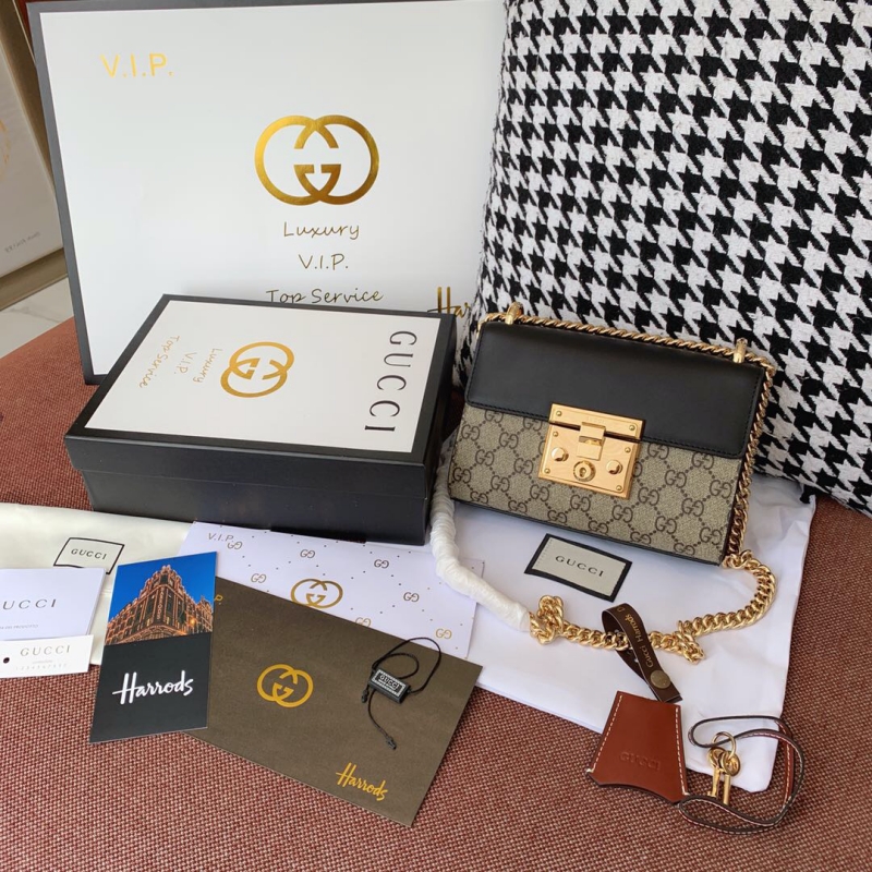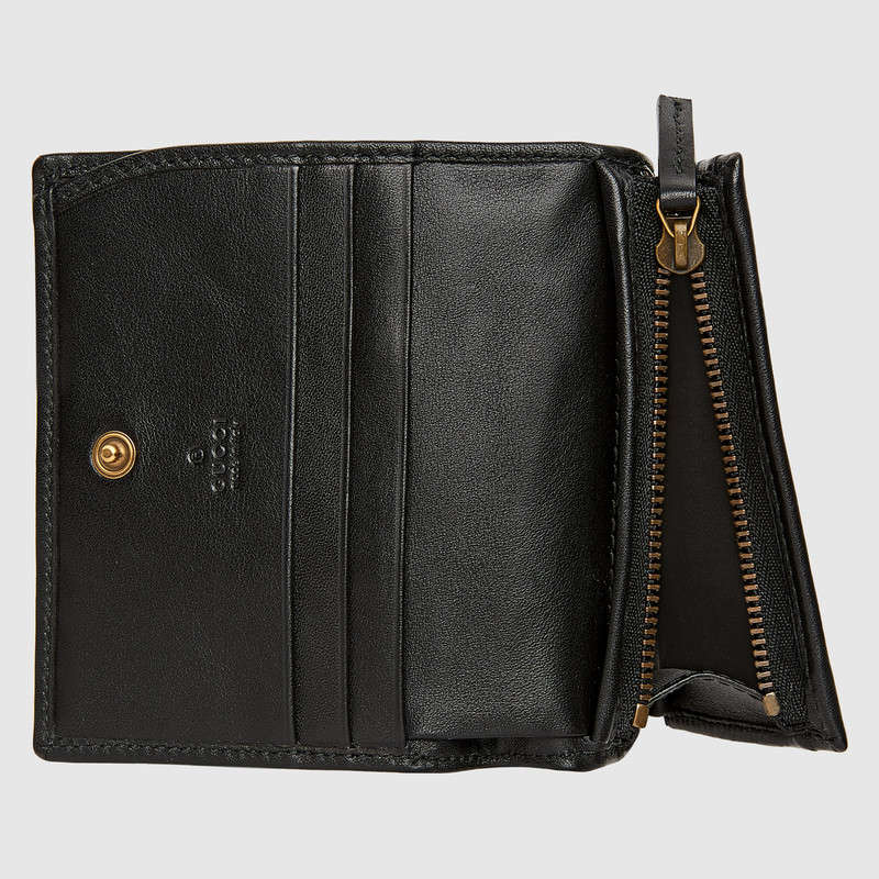 - 结构:古铜色金属配件,双G标志,按扣,四个卡片隔层和一个钞票隔层,两个平口袋,一个拉链袋