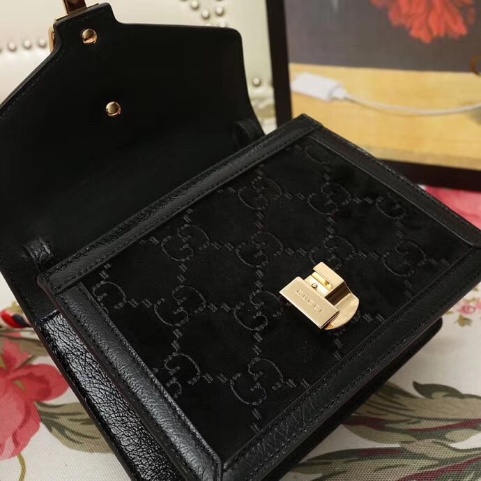 - 470270 Gucci Sylvie新款 丝绒拼皮 链扣 编织绳肩带 手提肩包 黑色