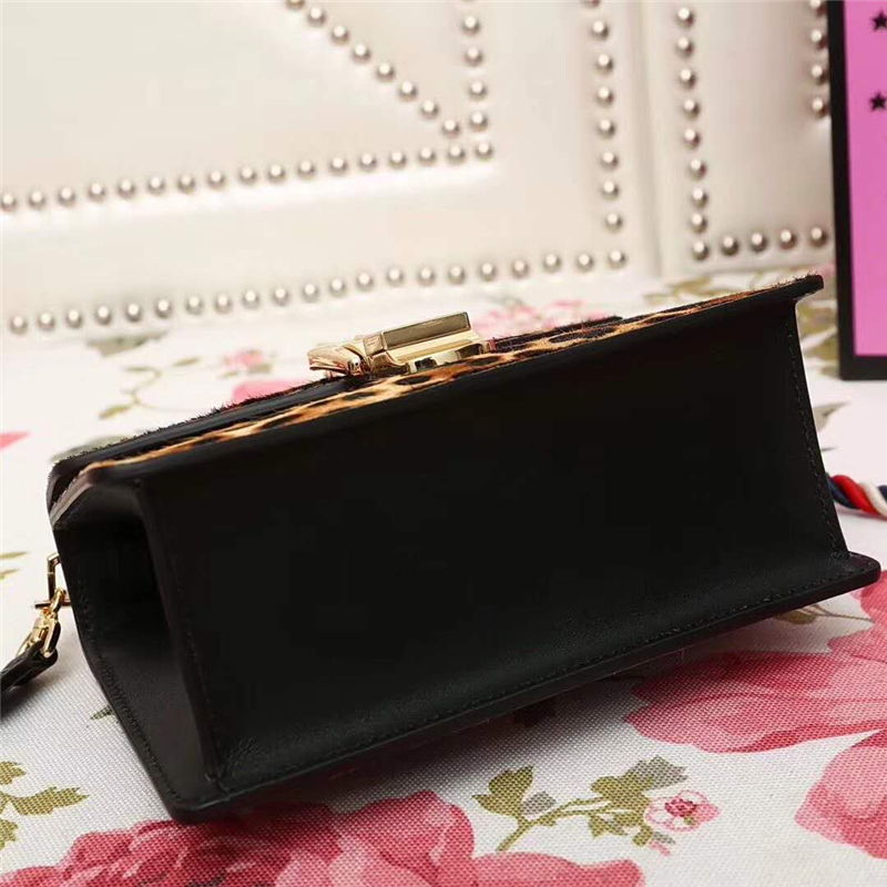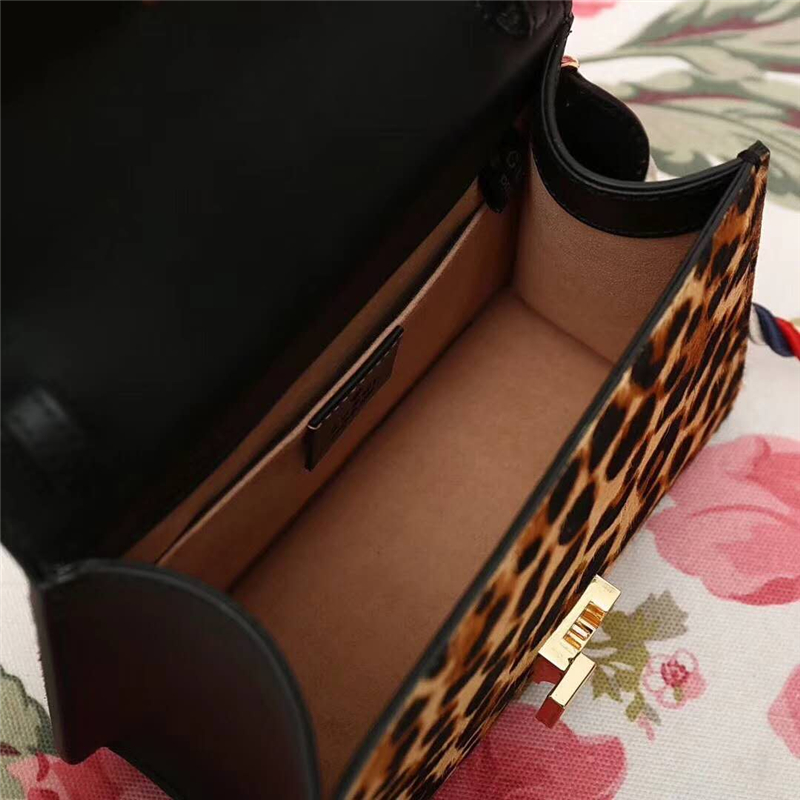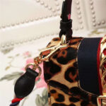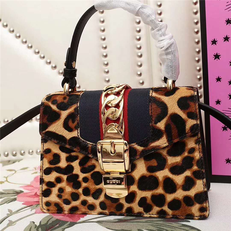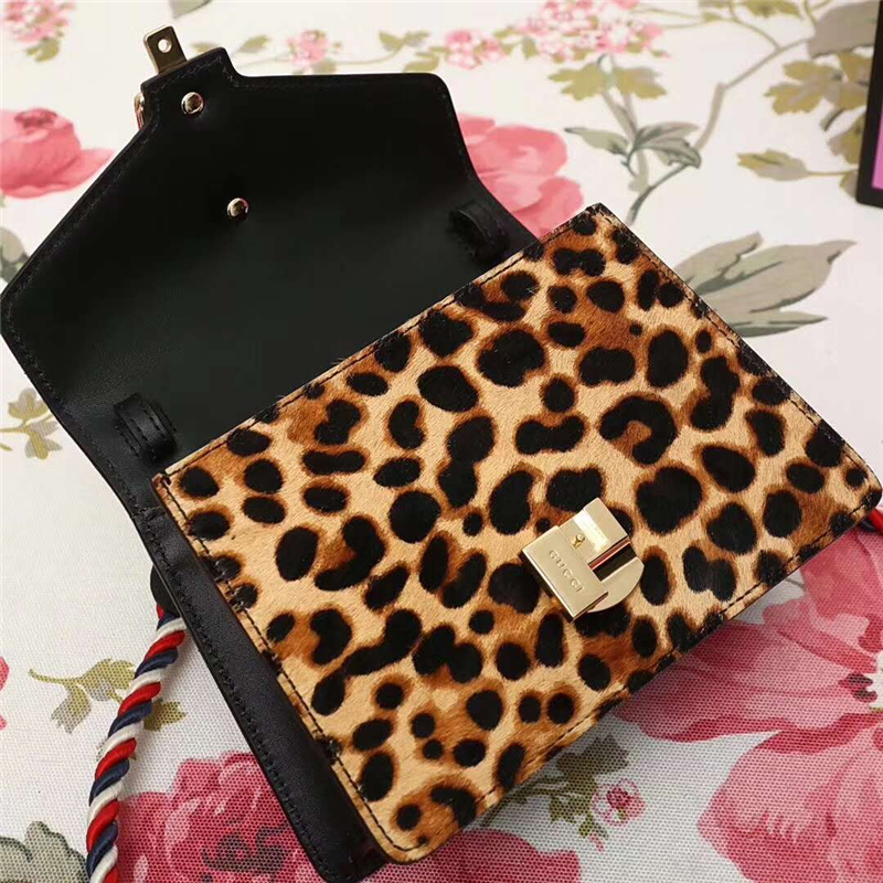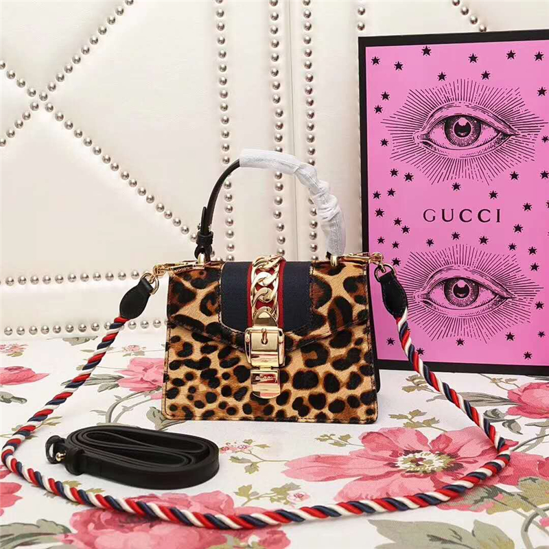 - 470270 GUCCI Sylvie新款 豹纹金链扣 编织绳肩带 手提肩包 啡色