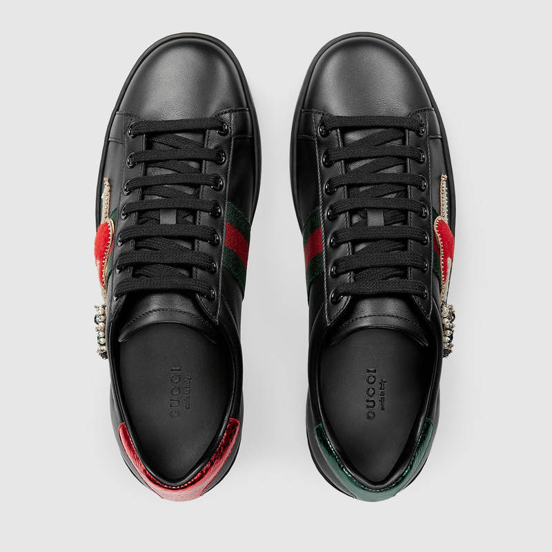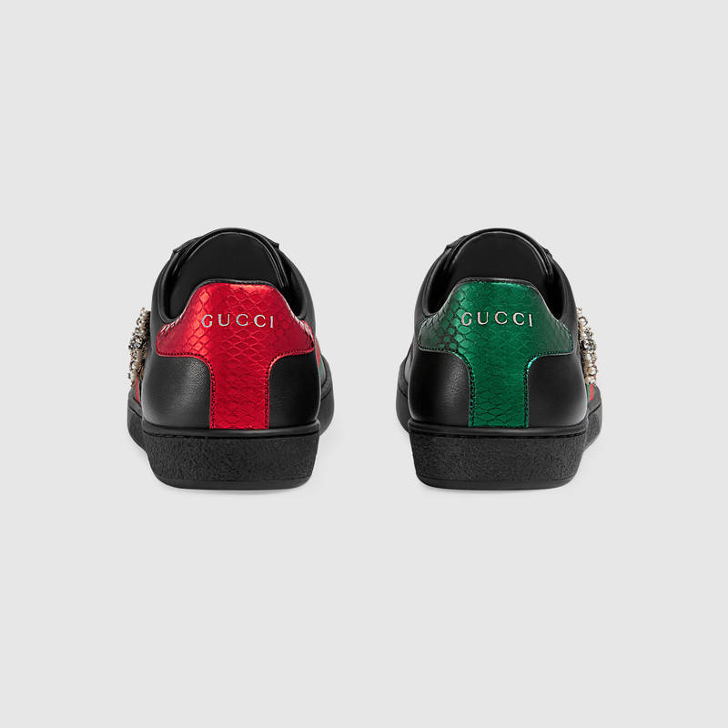 - 详细介绍:皮革Ace系列运动鞋,绿/红罗缎织带上精心装饰一箭穿心贴花。每只鞋的背面都饰以绿色或红色水蛇皮细节。
