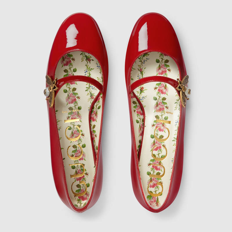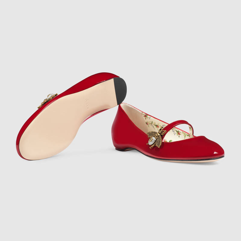 475832 GUCCI 蜜蜂装饰 漆皮 芭蕾舞鞋 芙蓉红