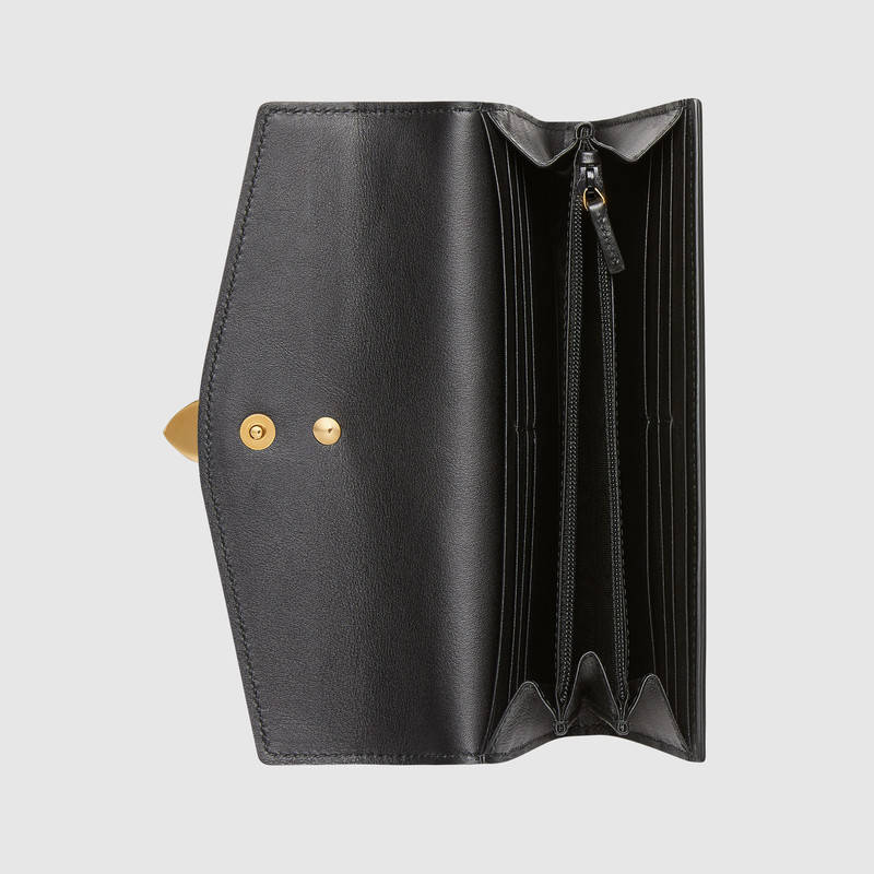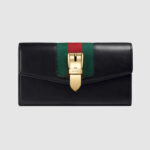 476084 GUCCI Sylvie 系列 皮革 蓝红尼龙织带拼皮 长款皮夹 黑色