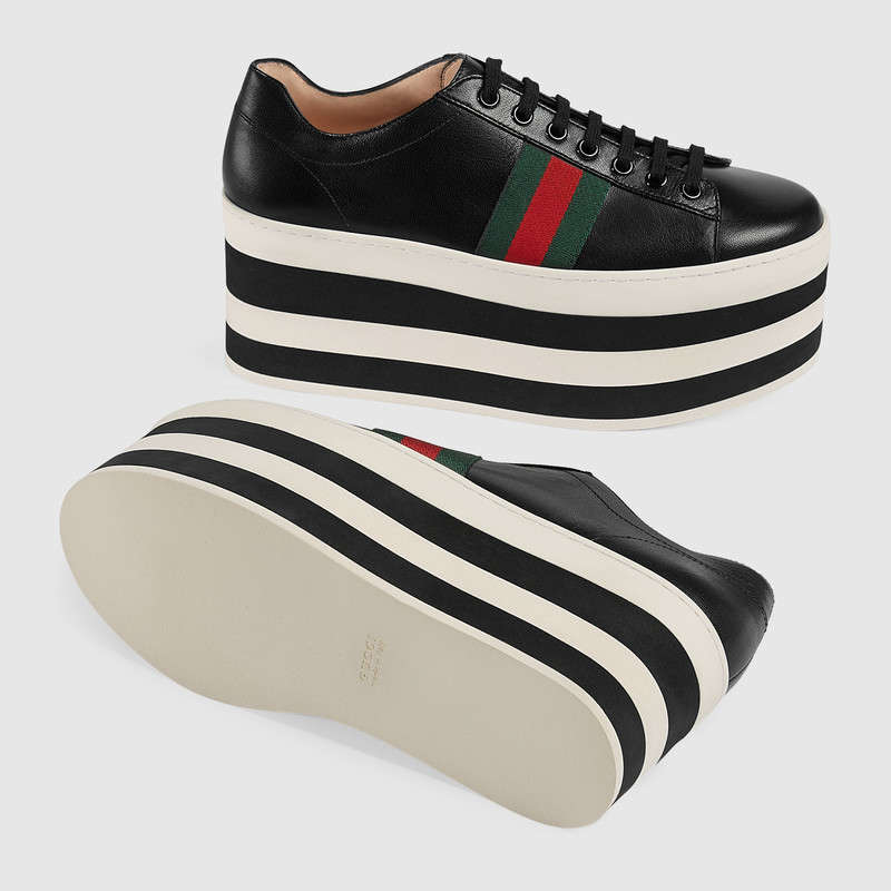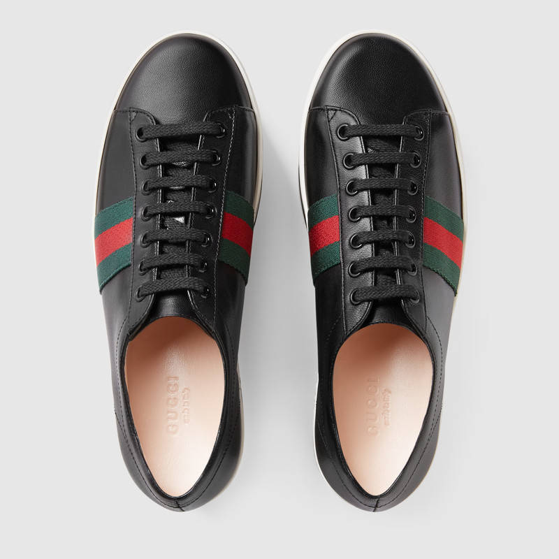 - 详细介绍:皮革运动鞋设计有黑色和白色条纹防水台。在经典系带鞋上大胆地运用多种色彩和罗缎织带,是对Gucci精神的致敬。