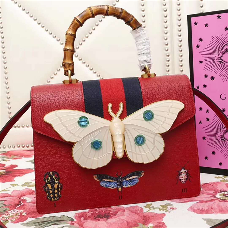 - 488691 Gucci 2017秋冬走秀款 竹节提手 蝴蝶配饰 手提单肩包 红色