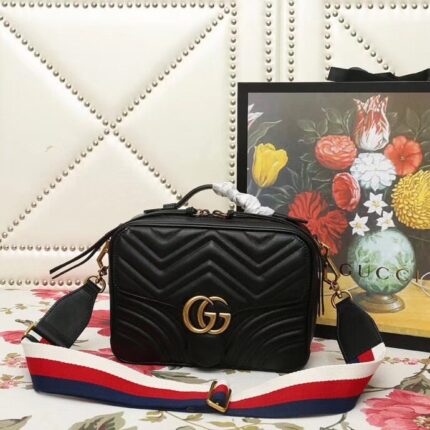 - 详细介绍:GG Marmont系列肩背包采用颇具结构感的柔软造型设计,全拉链式闭合,超大造型设计正面翻盖上装饰双G配件。肩带装饰Sylvie织带条纹,由Gucci蓝白红织带条纹演化而来。采用绗缝人字纹皮革精心打造,背面配以心形图案。