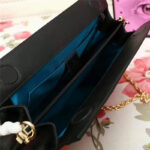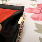 - 结构:真丝衬里,磁扣,两个隔层,红蓝织带,金色调配件,链式肩带