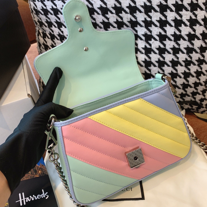 - 结构:淡彩色绗缝V型设计皮革材质,背面饰心形细节古金色调配件麂皮质感超细纤维衬里双G内部开口袋皮革提手(6厘米高)饰皮革细节可拆卸链式肩带(55厘米高)重量:约0.6千克