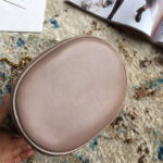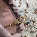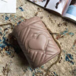- 结构:灰粉色绗缝V形皮革,背面饰有心形图案 古金色调配件 双 G 可拆卸钥匙圈 2 个卡片隔层 链式肩带(60 厘米高) 抽绳固定 也可作为斜挎包使用