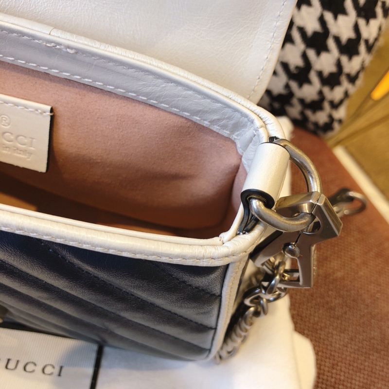 - 结构:蓝色复古风格斜纹绗缝皮革 白色皮革滚边 复古银色调配件 麂皮质感超细纤维衬里 双 G 内部开口袋 可拆卸链式肩带(55.5 厘米高) 提手(6 厘米高) 弹簧扣翻盖 重量:约0.6千克