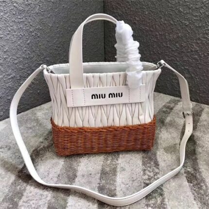 5BA076 MIUMIU专柜新款 小羊皮 编织柳条 方形桶包 白色